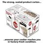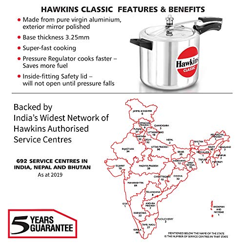 Each pressure cooker made by Hawkins features an inside-fitting lid. This design is inherently safer than conventional pressure cookers. To open any Hawkins cooker you have to first lower the lid slightly into the body of the cooker; and that cannot be done until the steam pressure inside the cooker falls to a safe level. Thus Hawkins pressure cookers are pressure-locked for safety.