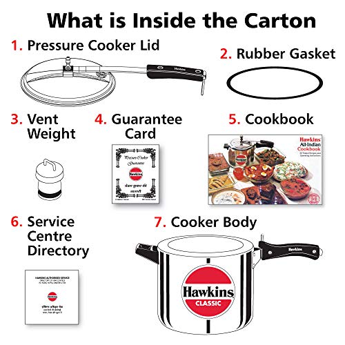1 - Cooker Body 1 - Cooker Lid 1 - Vent Weight 1 - Rubber Gasket 1 - Guarantee Card 1 - Cookbook 1 - Service Centre Directory