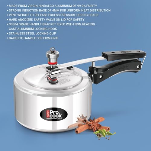 • Pro Cook pressure cookeer is made up of virgin hindalco Aluminium. It has thick induction base of 4mm for even heat distribition. The inner part of the cooker has a matt finish & outer body comes with a super glossy finish. It is suitable for cooking on i