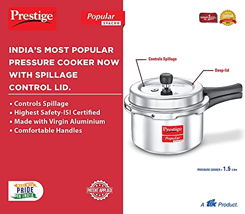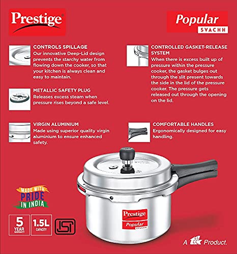 The Prestige Popular Plus Svachh Aluminium Pressure Cooker bringd the best cooking experience to your kitchen. Its unique design helps you cook faster and the innovative deep-lid keeps your kitchen clean at the same time. Manufactured from Virgin Aluminium to ensure zero contamination the cooker boasts of high quality raw materials. Perfected over a period of time with the trade mark Prestige engineering expect the very best with up-to-date innovations and features. Add to that the elegant design and splendid finish the cooker is a sheer pleasure to cook with.