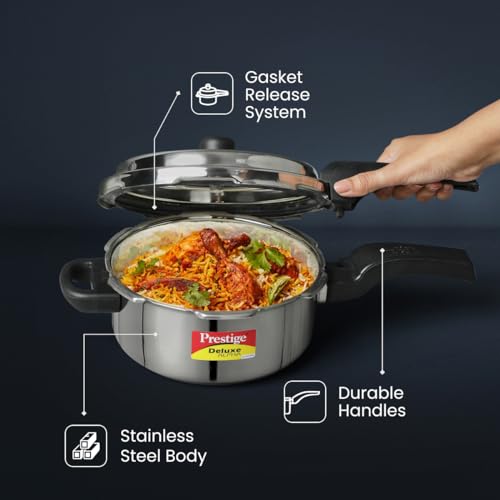 Prestige 3L Svachh Deluxe Alpha stainless steel Pressure Cooker|Outer lid|3-4 personsl|Deep lid for spillage control|Gas & induction compatible|Controlled GasketRelease System|Silver|10 years warranty