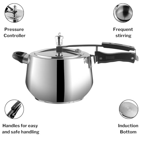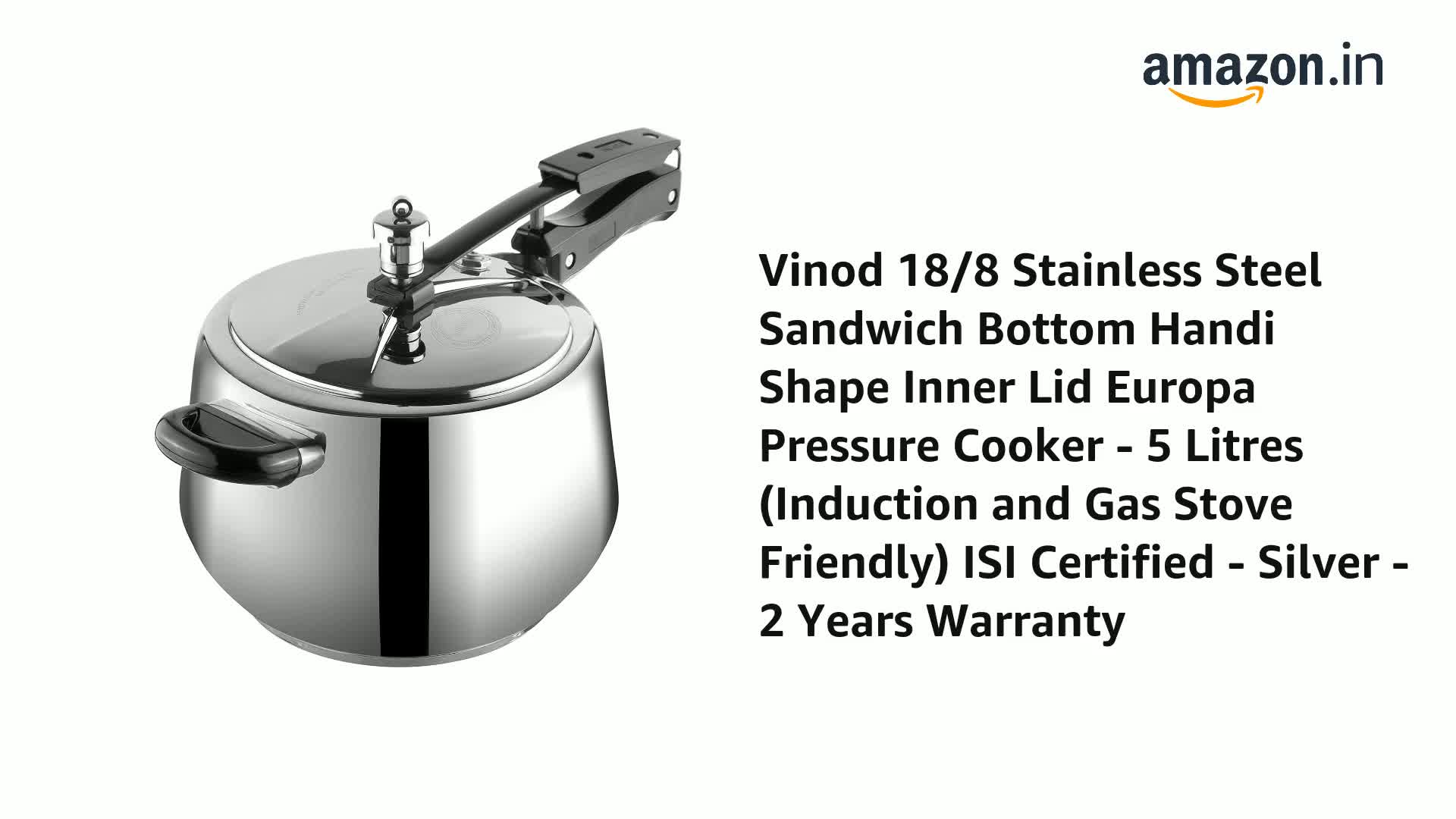 Vinod 18/8 Stainless Steel Sandwich Bottom Handi Shape Inner Lid Europa Pressure Cooker - 5 Litres (Induction and Gas Stove Friendly) ISI Certified - Silver - 2 Years Warranty