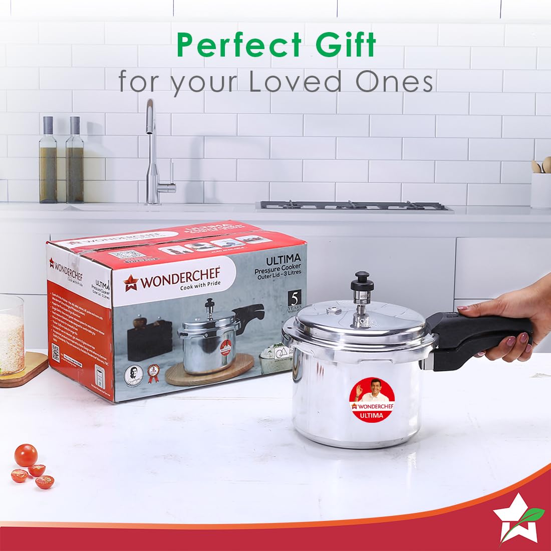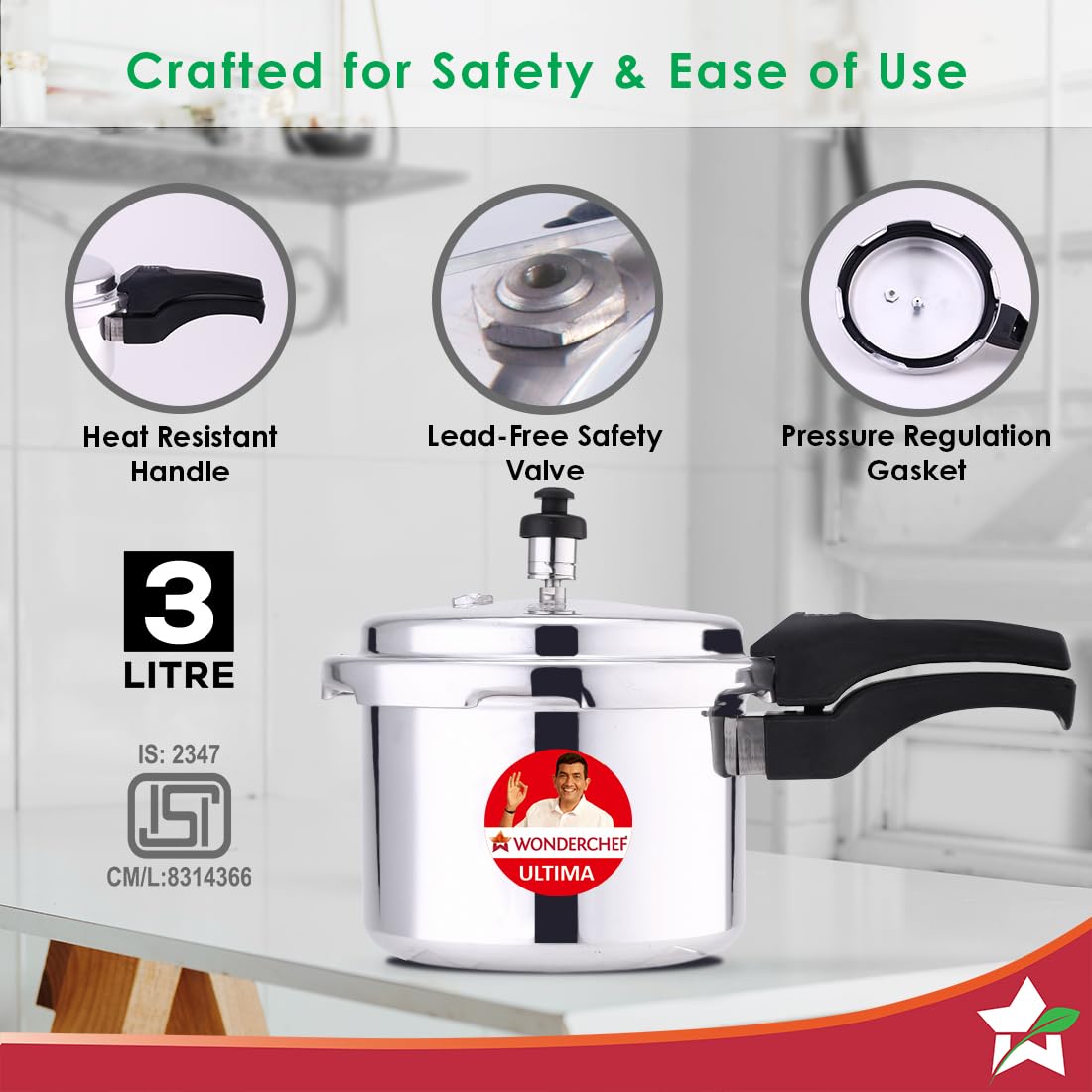 Size:3 LitersCook all kinds of dishes - rice dal sabzi stews idli pulao and more with Wonderchef Ultima Range of Presure Cookers .Made from Pure Grade Virgin Aluminium .Single Safety Valve and gassket release system for easy Presure release .Heat resistant Bakelite handle designed for comfortable grip .Mirror finish body for a beautiful look .Thicker 3.25 mm body for longer life .Suitable for use on induction gass electric & glass stove tops .Reliable Wonderchef warranty T&C Apply