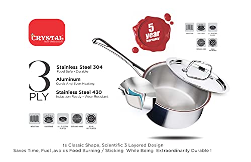 Crystal Tri-Pro Triply Stainless Steel cookware is made of Triple layered stainless steel which transfers heat and spreads it quickly evenly and precisely throughout the cookware all the way to the rim prevents hot spots resulting in a evenly cooked Healthy Meal.Must have for every Kitchen.