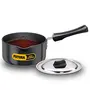 Futura Hard Anodised Induction Compatible Saucepan is extra thick and durable. The black metal spreads heat quickly. It is not spoilt by high heat. Metal ladles can be used. It is non-toxic non-staining and non-reactive with foods. It stays looking new for years. It has sturdy stay-cool handles. Heat source domestic gas electric halogen ceramic and induction cooktops. It is provided with a food-grade stainless steel lid.