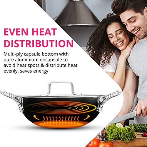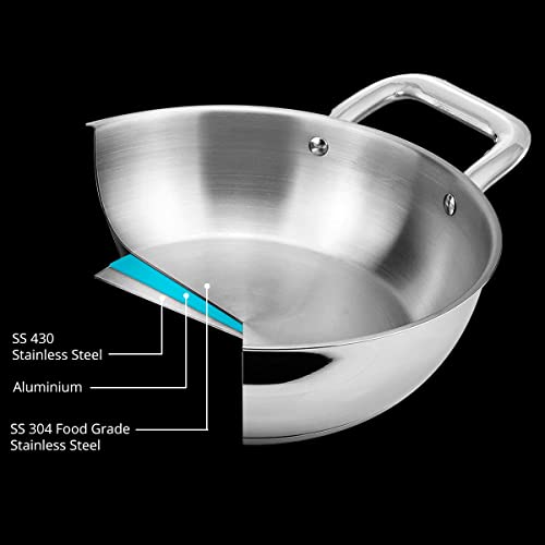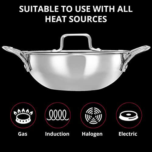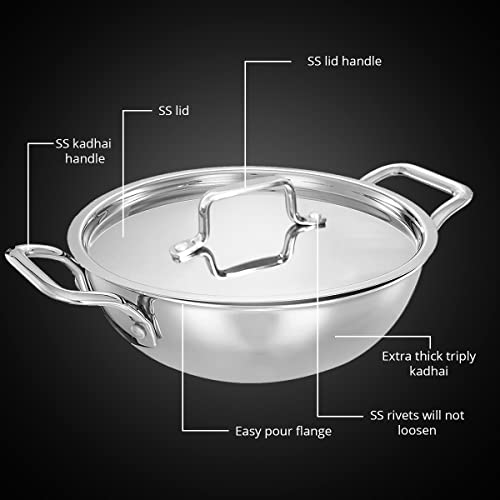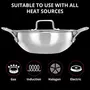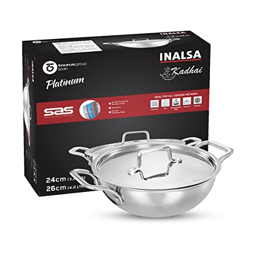 INALSA Platinum Triply Stainless Steel Kadai with Stainless Steel Lid 4 litres Capacity (26 cm Diameter) | 4 L Triply Stainless Steel Kadai - Silver (Induction and Gas Stove Friendly)