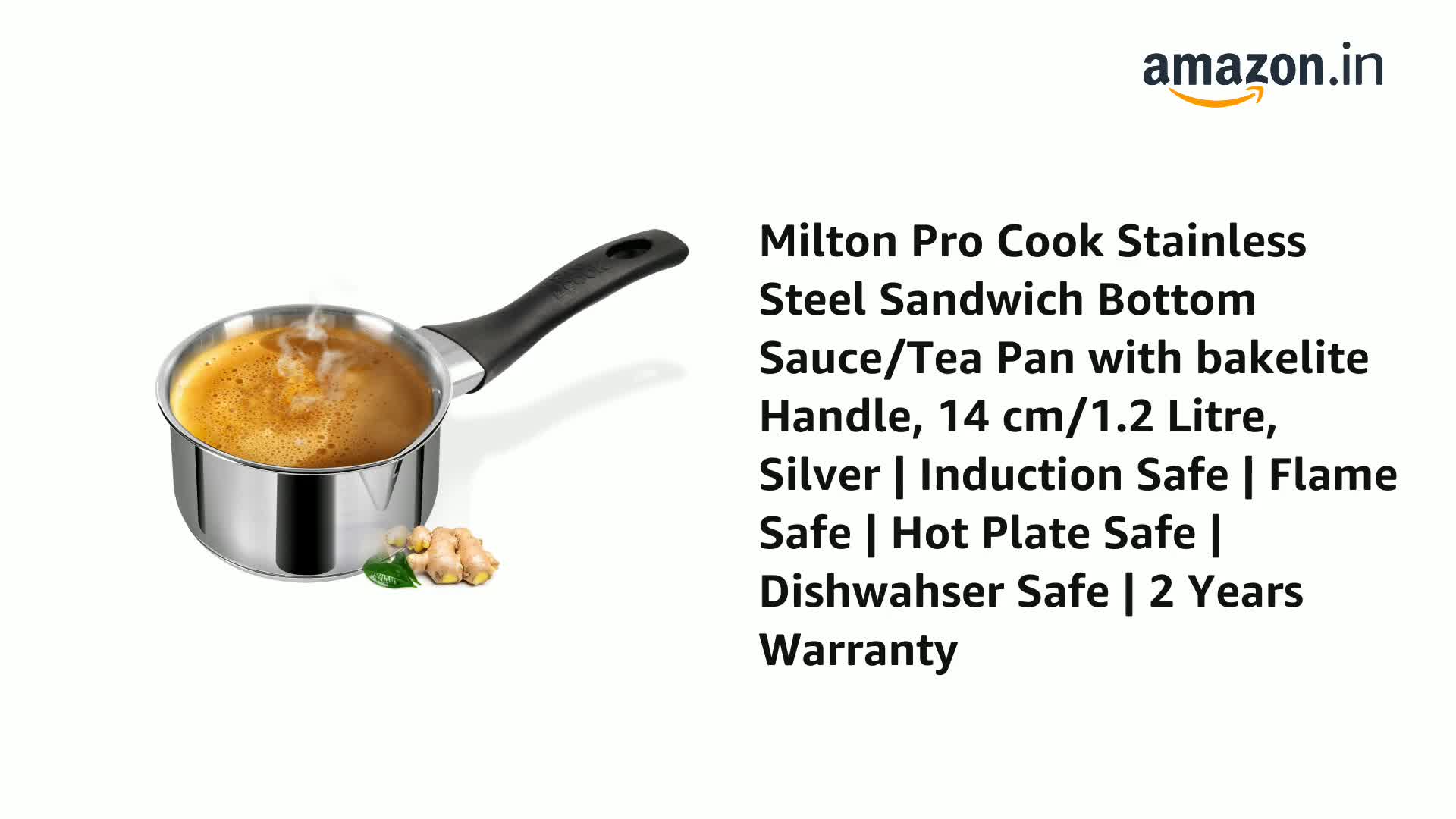 Introducing Milton Pro Cook Stainless Steel Sandwich Bottom Sauce Pan. Sandwich Bottom sauce pan is suitable for making soups sauce tea boiling milk boiling veggies cooking grains and much more. Superior hygienic stainless steel Sauce Pan having glossy mirror finish outside and matt finish inside for rich premium feeling. Firmly riveted bakelite handle with two rivets for long lasting usage. A saucepan is a multi-functional and essential kitchen accessory for day-to-day cooking. Specially designed easy-pour spout for pouring your favourite beverage to your mug or bowl. It is Dishwasher safe pan for ease of cleaning and maintaining your pan. Thick induction base which provides flexibility of using the pan on gas stove induction hot plate and also evenly heats your beverage. This Product Is Under 2 Year Warranty From The Date Of Retail Purchase Against Any Manufacturing Defects In Material And Workmanship. The Warranty Does Not Cover Damages Resulting From Accidents Mishandling Or Tampering With The Mechanism. Warranty Valid Against Producing Original Bill Endorsed By Seller.