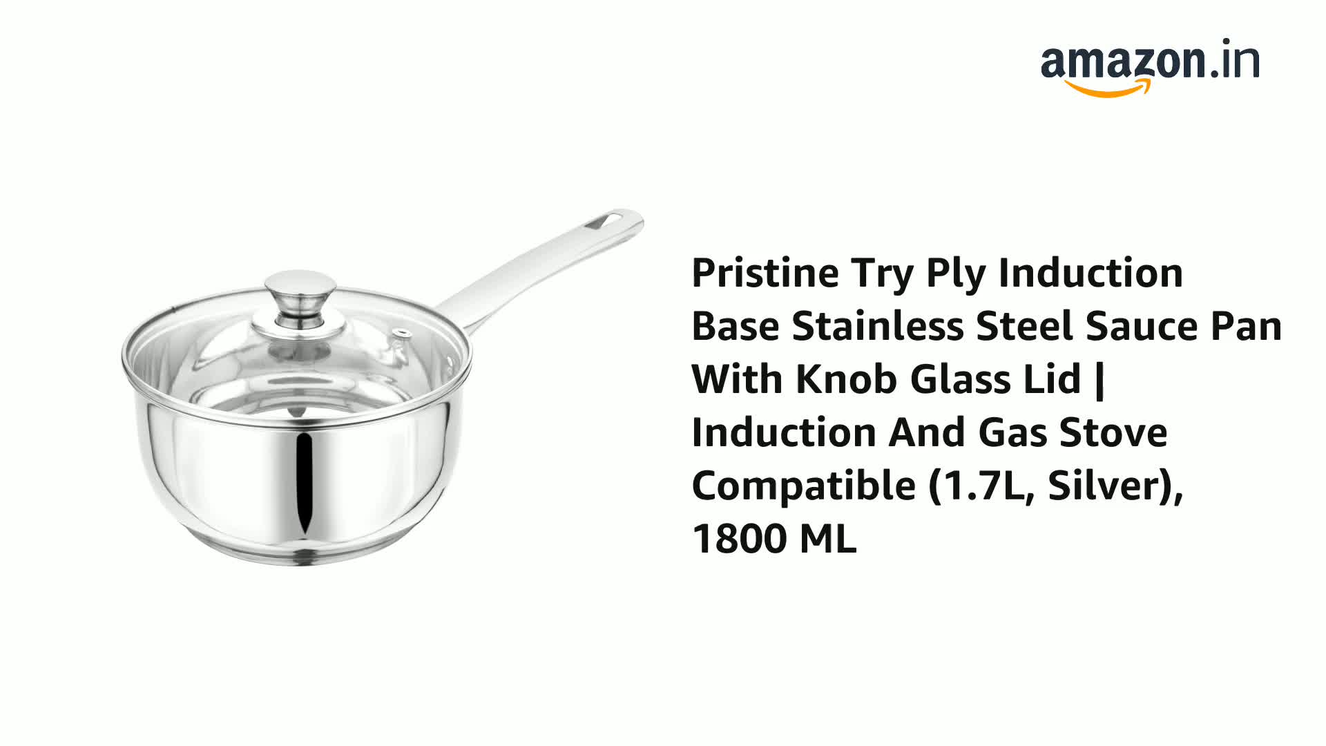 Pristine Try Ply Induction Base Stainless Steel Sauce Pan With Knob Glass Lid | Induction And Gas Stove Compatible (1.7L, Silver), 1800 ML