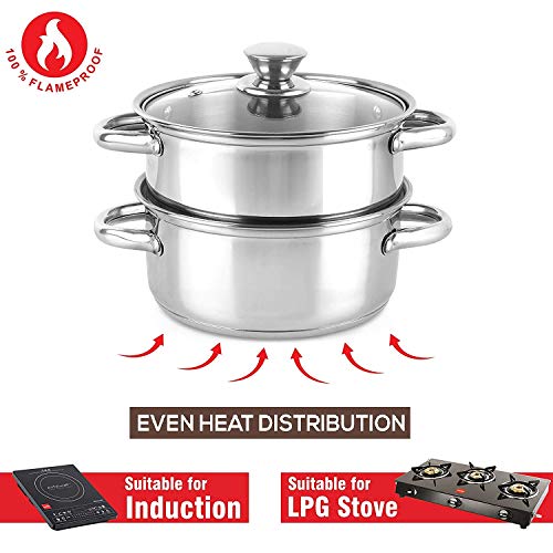 Pristine Stainless Steel Tri Ply Induction Base 2 Tier Multi Purpose Steamer/Modak Maker with Glass Lid, 18cm, Silver