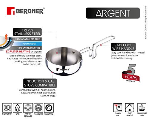I recently purchased the BERGNER Quart Steel Triply Tadka pan, and I have to say, I'm thoroughly impressed with the quality and functionality of this product. The triply steel construction ensures even heating, and the compact size makes it perfect for tadka or tempering. The handle is sturdy and heat-resistant, allowing me to handle the pan with ease while cooking. Overall, this is a wonderful addition to my kitchen, and I would highly recommend it to anyone needing a reliable tadka pan. Thank you, BERGNER and Silkrute.in for providing such a high-quality product!