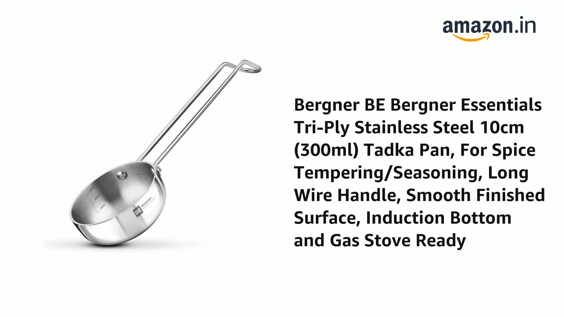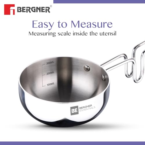 BERGNER BE Essentials Tri-Ply Stainless Steel 10cm (300ml) Tadka Pan, for Spice Tempering/Seasoning, Long Wire Handle, Smooth Finished Surface, Induction Bottom and Gas Stove Friendly