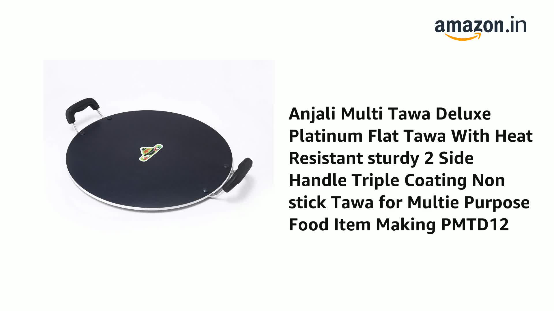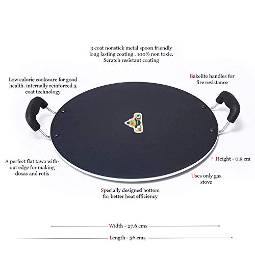 A perfect flat tawa without edge for making dosas and roti's. Low calorie cookware for good health. Internally reinforced 3 coats technology. Specially designed bottom for better heat efficiency. 3 coat nonstick metal spoon friendly long lasting coating. 100 percent non toxic. Scratch resistant coating.