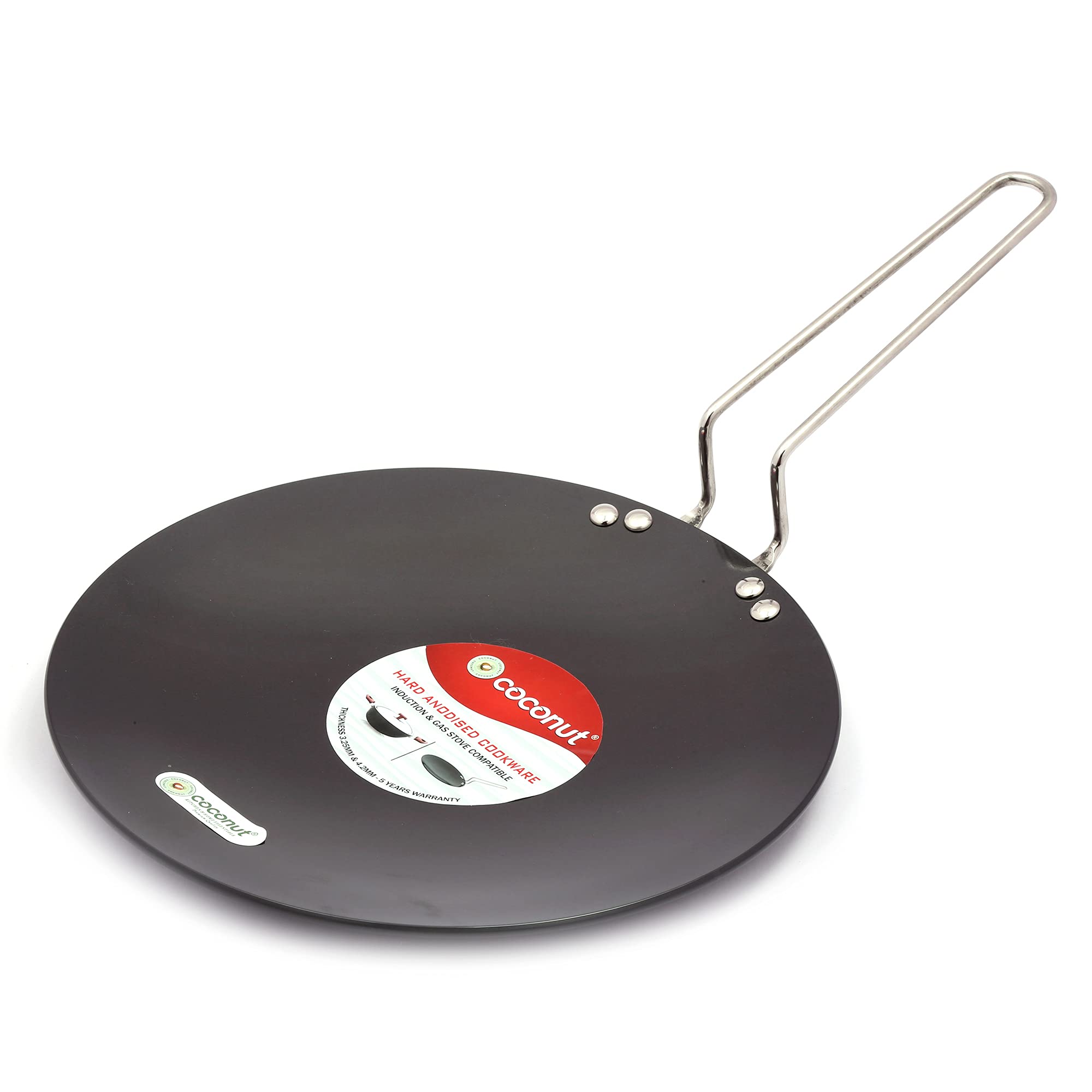 Coconut offers a range of quality products from the house of BM agencies. We mainly offer a wide range of high-quality kitchen products that are well checked before being launched into the market. Each product goes through a high level of quality check. We ensure that our range of products just don't look good but serves it purpose at its best. In This Hard Anodised Tawa - we are Using Heavy Guage Pure Aluminium it is thermal efficient: heats fast and evenly not spoilt by hight heat 2.4 times harder than steel Metal Ladles can be used Need some water or oil to prevent sticking Cooks food faster and crisper Non - toxic non -staining non- reactive with food will not pit tarnish or corrode Stays looking for years. Product Content - Coconut Hard Anodised Concave Tawa - 4.2 MM Thickness. Product Dimension -26Cm Diameter