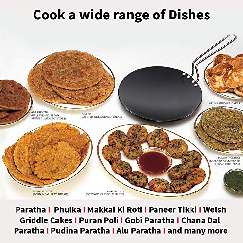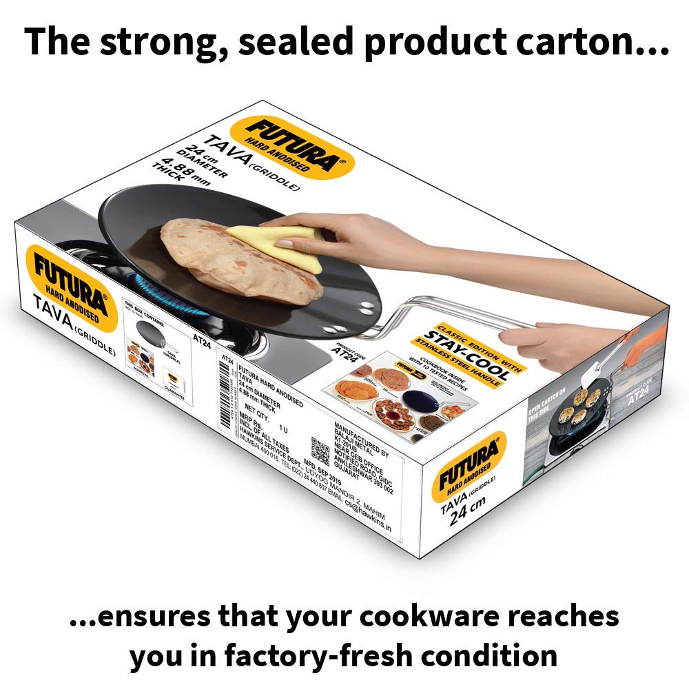 Hawkins Futura Hard Anodised Tawa - Tava are widely used to cook roti (flatbreads) phulka (puffed unleavened bread) and paratha (layered unleavened bread) - all staple foods in India. Tava can also well cook cutlets eggs pancakes French toasts griddle cakes and the like. Futura Hard Anodised Tava are particularly preferred for their heavy gauge and well-balanced pans that make cooking easy and the results delicious. The handles whether in stainless steel or plastic are stay-cool and comfortable.