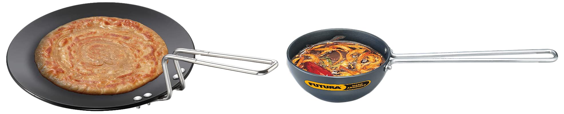 Hawkins - L-59 Futura Hard Anodised Tawa 28cm BlackFutura Hard Anodised Tava are particularly preferred for their heavy gauge and well-balanced pans that make cooking easy and the results delicious. The handles whether in stainless steel or plastic are stay-cool and comfortable. Tava are widely used to cook roti (flatbreads) phulka (puffed unleavened bread) and paratha (layered unleavened bread) all staple foods in India. Tava can also well cook cutlets eggs pancakes French toasts griddle cakes and the like.Hawkins - L34 Futura Hard Anodised Tadka Spice Heating Pan 2 Cup480ml/3.25mm Thickwith handle black colour hard anodised
