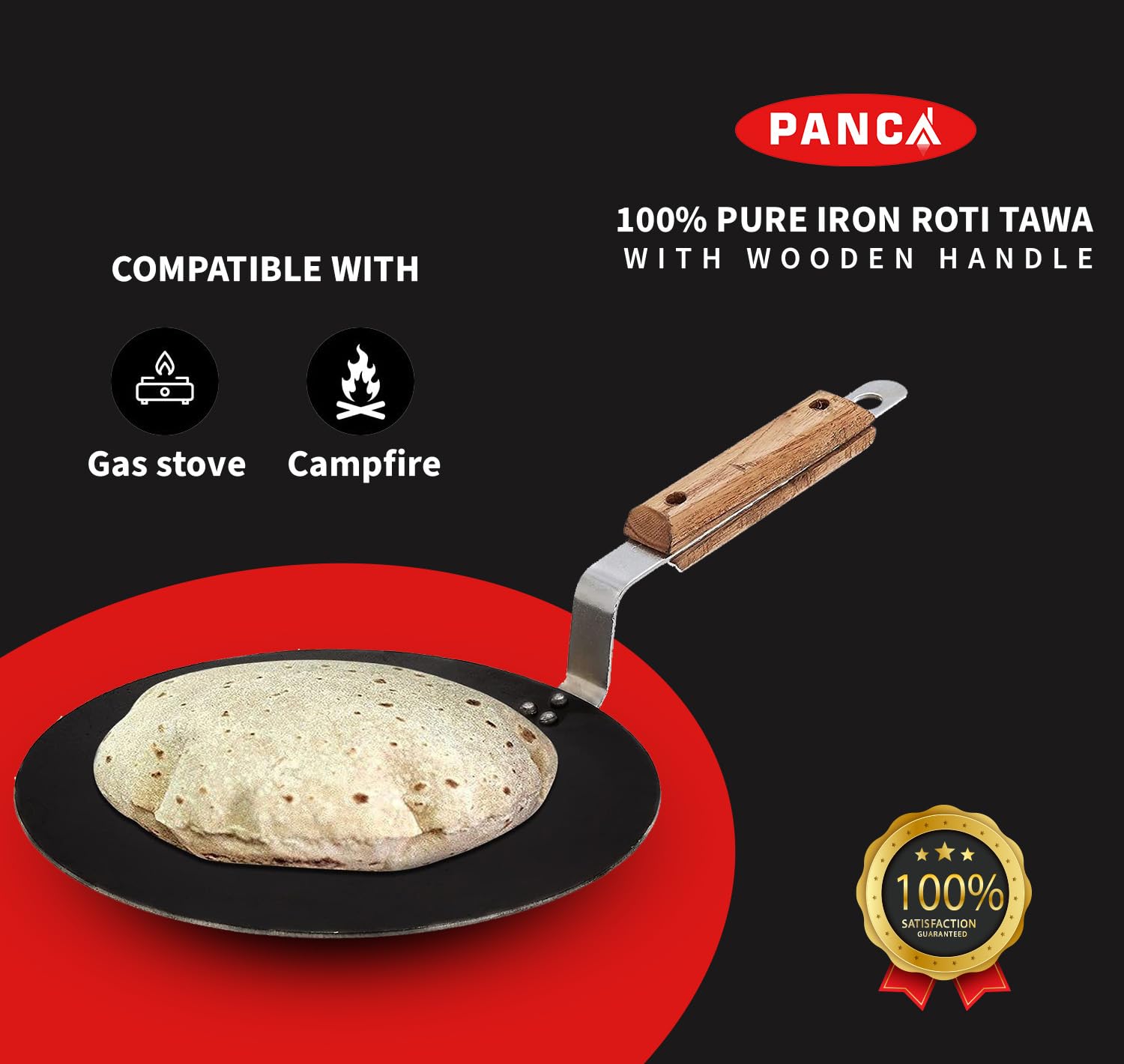Strong Wooden Handle: The 10.5 inch diameter PANCA Iron Tawa features a sturdy wooden handle that provides a comfortable grip and excellent control while cooking ensuring safe and effortless handling.