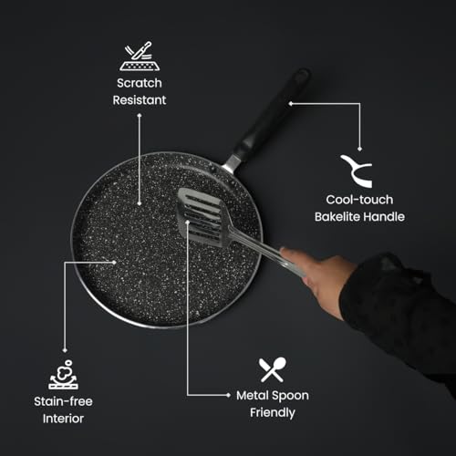 • Nonstick aluminium tawa with durable granite-finish coating