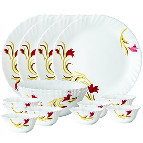 Borosil Larah Red Lily Opalware Dinner Set, 14-Pieces, White
