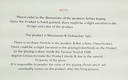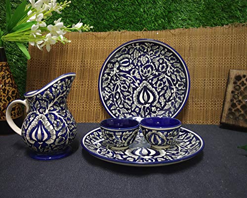 Blue Mughal dinner set gives the required boldness yet soothing to the eyes because of the glossy ceramic finish. Handcrafted pattern adds classic effect to this dining beauty. Those who have love for their food and their kitchen can just not get over this. 100 % Handmade with Royal Finish. This is one of the most gracious product from Caffeine. COLOR: blue. All colors used on our dinnerware are food safe. CRAFT: Stoneware. COMPONENTS: 2 dinner plate (10 inch) 2 dessert bowl 1 Water Jug (600 ml) PRODUCT CARE: Avoid scratching with hard bristled brushes. Dishwasher safe in mild cycle. Microwave/Induction safe. Not suitable for direct burner. Only use indirect sources of heat. Do not put it in pre-heated oven/microwave. Do not freeze at high freezing temperature. NOTES: Set of 1. Slight and minor color change could be noticed as each product is individually made by hand. Flash used in the shoot and difference in screen resolutions could also be a reason.