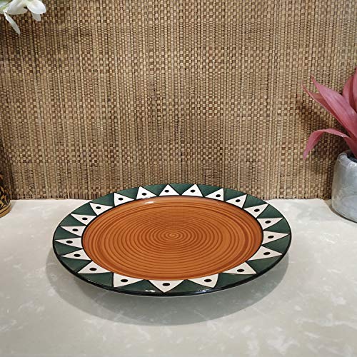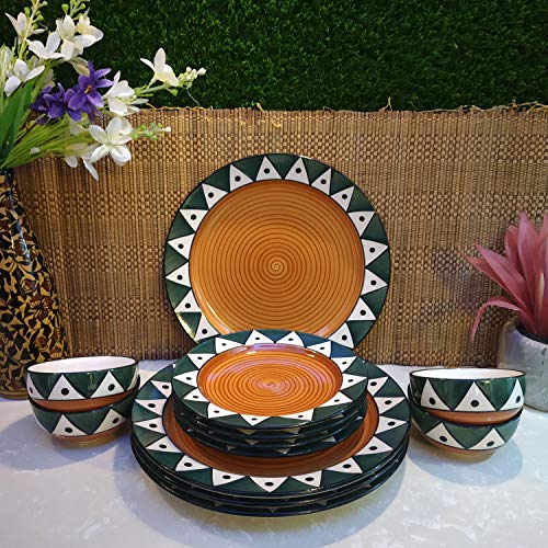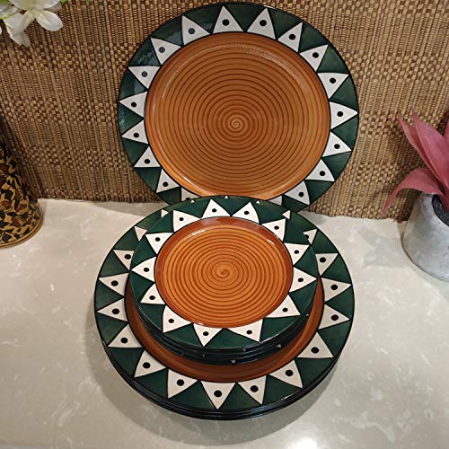 Green Soorya Dinner set gives the required boldness yet soothing to the eyes because of the glossy ceramic finish. Handcrafted pattern adds classic effect to this dining beauty. Those who have love for their food and their kitchen can just not get over this. 100 % Handmade with Royal Finish.This is one of the most gracious product from Caffeine. COLOR: Green and Brown. All colors used on our dinnerware are food safe. CRAFT: Stoneware. COMPONENTS: 4 Dinner plates 4 Katori Bowls 4 Quarter Plates. PRODUCT CARE: Avoid scratching with hard bristled brushes. Dishwasher safe in mild cycle. Microwave/Induction safe. Not suitable for direct burner. Only use indirect sources of heat. Do not put it in preheated oven/microwave. Do not freeze at high freezing temperature. NOTES: Set of 12 . Slight and minor color change could be noticed as each product is individually made by hand. Flash used in the shoot and difference in screen resolutions could also be a reason