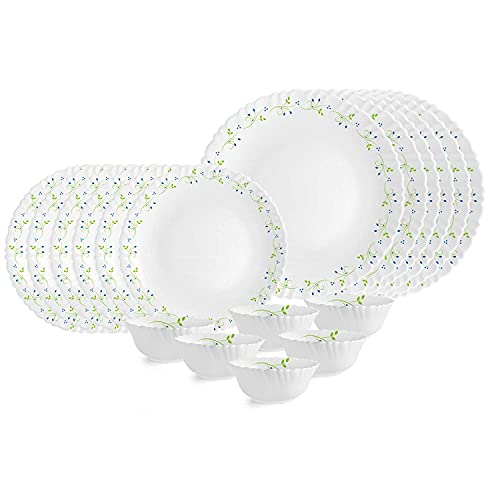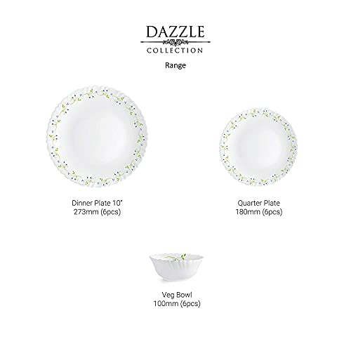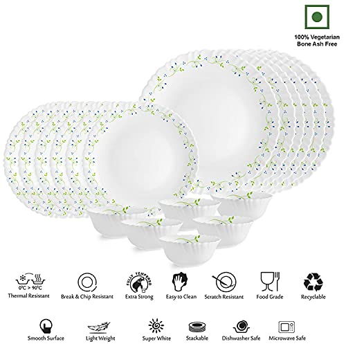 Made in India with most advanced German technology as per European standards Bacteria free-non porous and hygienic for your family. Thermal resistance 0 degree > 90 degree 100 percent vegetarian - bone ash free and made of green material Thermal resistant - no cracks on heating food in microwave from refrigerator Break chip and scratch resistant-made for everyday use Dishwasher safe micro wave safe and stackable fully tempered up to 3 times stronger recyclable easy to clean Food grade 100 percent hygienic This dinner set is lightweight easy to clean and strong. Vibrant designs that make dazzling white wares look beautiful Smooth surface light weight stackable super white Color: White Material: Opalware. Package Contents: 6-Piece Dinner Plate (10inch) 6-Piece Quarter Plate (200mm) and 6-Piece Veg Bowl (100mm)