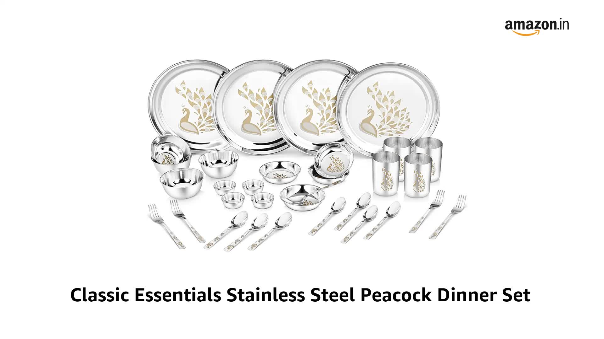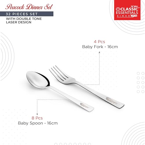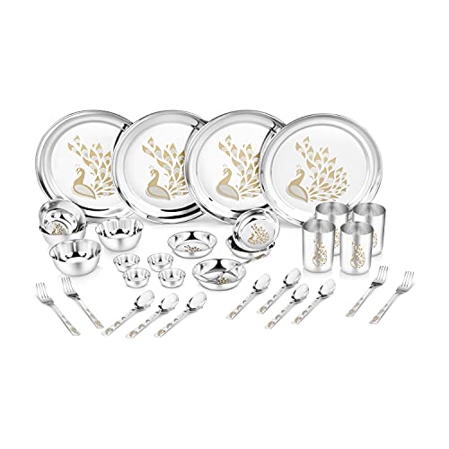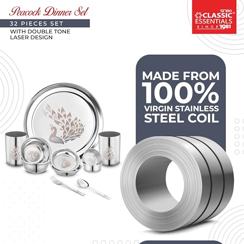 Classic Essentials Stainless Steel Dinner Set|Serves 4 People|Heavy Gauge|Kitchen Set|Permanent Laser-Peacock, Set of 32