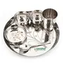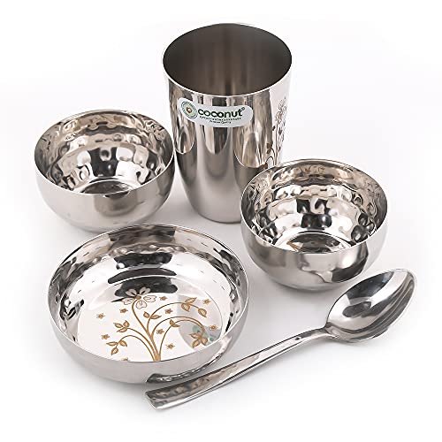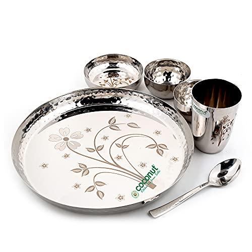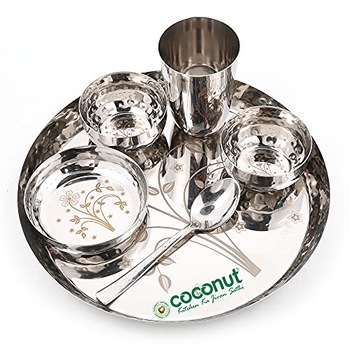 Coconut is a range of innovative and Quality products for Home and Kitchen. Coconut always keeps striving to provide you with the most Authentic products. Add Something Unique To Your Dinnerware With this 6 Piece Laser Dinner Set. These Dinner Sets are crafted from Food Grade Premium Quality Stainless Steel material with Permanent Laser engrave design. Rust Proof and Hygienic. It is very easy to clean and maintain. It is non breakable durable sturdy and long lasting. Dishwasher Safe & BPA free. This Dinner set is ideally used as Gifting options for your Relatives or Friends on the Occasions like Marriage House warming Ceremony and other events. Product Content : SS Canopus Laser Engrave 6 Piece Dinner Set ( 1 - Full Plate Thali / Dinner Plate 2 Bowls 1 Mini Halwa Plate 1 Glass & 1 Spoon. ) Dimensions - Full Dinner Plate -11" Glass - Height - 9.5Cms Width - 8 Cms Halwa plate - Width - 10 Cm 2.5Cms Bowls - 2 piece - Width - 9 Cms Height -3.5 cms Spoon - 16Cms Length .