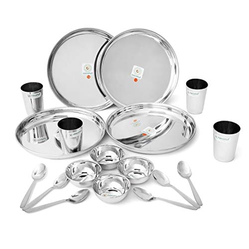 Coconut is a Range of Innovative and products for Home and Kitchen. These Dinner Sets are crafted from Food Grade Stainless Steel material. Rust Proof and Hygienic. It is very easy to clean and maintain. Dishwasher Safe & BPA free. This Dinner set is ideally used for everyday usage and it is also used as Gifting options for your Relatives or Friends on the Occasions like Marriage House warming Ceremony and other events. Product Content : Coconut Stainless Steel Compact Dinner Set 18 Pieces Set (Beeding plate Thali 10 Size 12 4 Pieces) (Amitabh Water Glass 4 Pieces) ( Mukta Vati C9 Size 5 4 Pieces) & ( R3 Baby Spoon 6 Piece.