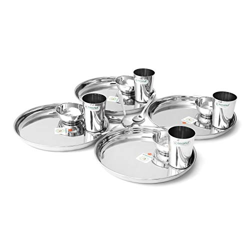 Coconut is a Range of Innovative and products for Home and Kitchen. These Dinner Sets are crafted from Food Grade Stainless Steel material. Rust Proof and Hygienic. It is very easy to clean and maintain. Dishwasher Safe & BPA free. This Dinner set is ideally used for everyday usage and it is also used as Gifting options for your Relatives or Friends on the Occasions like Marriage House warming Ceremony and other events. Product Content : Coconut Stainless Steel Compact Dinner Set 18 Pieces Set (Beeding plate Thali 10 Size 12 4 Pieces) (Amitabh Water Glass 4 Pieces) ( Mukta Vati C9 Size 5 4 Pieces) & ( R3 Baby Spoon 6 Piece.