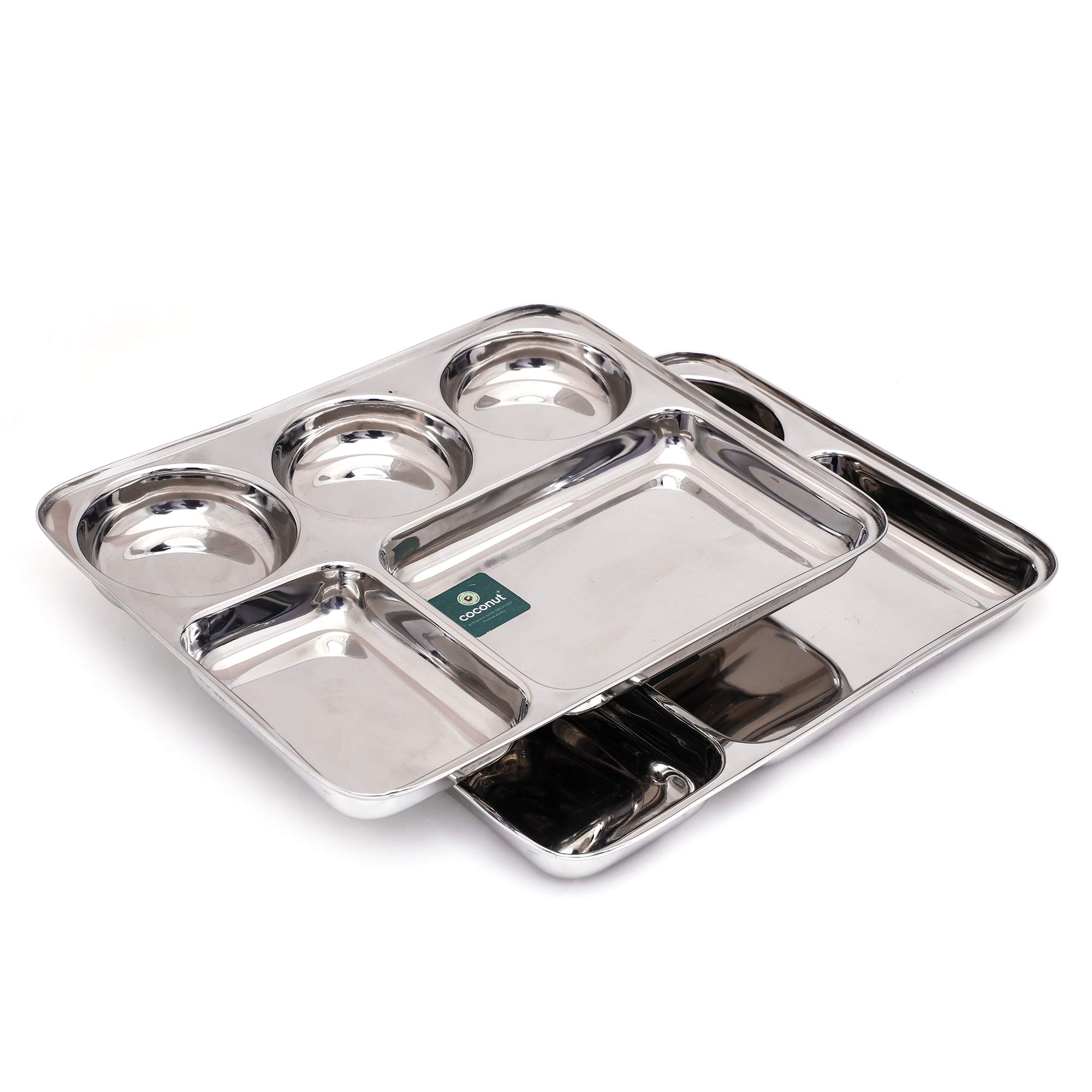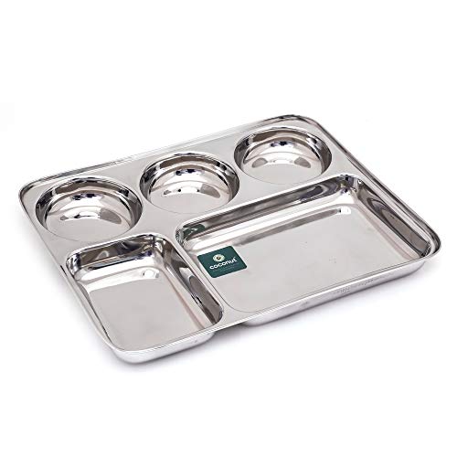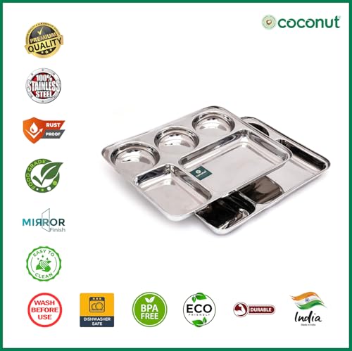 Coconut is a range of innovative and quality products for Home and Kitchen.This Mini Meals Lunch/Dinner Plates has 4 Partitioned Sections which is made from Stainless Steel material and it has long durabality with Heavy Guage.It comes with nice design and Mirror Finish.It can be used to gift your friends and relatives for all occasions. Product content : Coconut Stainless Steel 4 Partition Dinner/Thali/Bhojan/Breakfast plate 2 Units. Width -13 Inches Height - 10.5 Depth- 1 Inches
