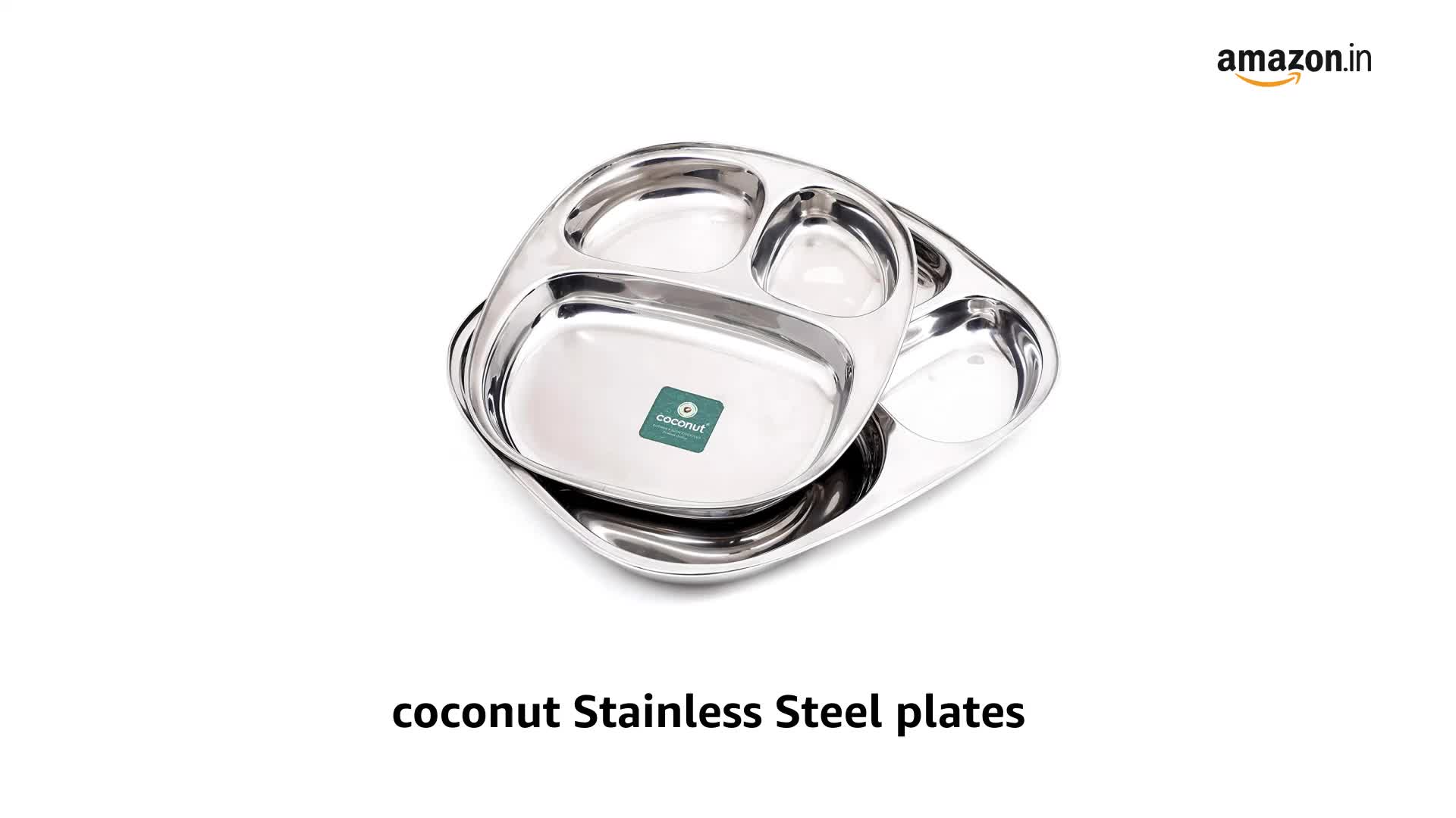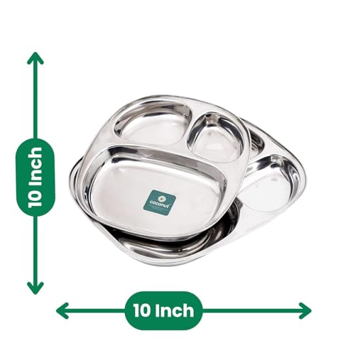 Coconut is a range of innovative and quality products for Home and Kitchen.This Dynasty Small Lunch/Dinner Plates has 2 Partitioned Sections which is made from Stainless Steel material and it has long durabality with Heavy Guage.It comes with nice design and Mirror Finish.It can be used to gift your friends and relatives for all occasions. Product content : Coconut Stainless Steel 2 Partition Dynasty Plate No. 3 - Dinner/Thali/Bhojan/Breakfast plates 2 Units.Dimension- Width -8 Inches Height - 10 Depth- 1 Inches.