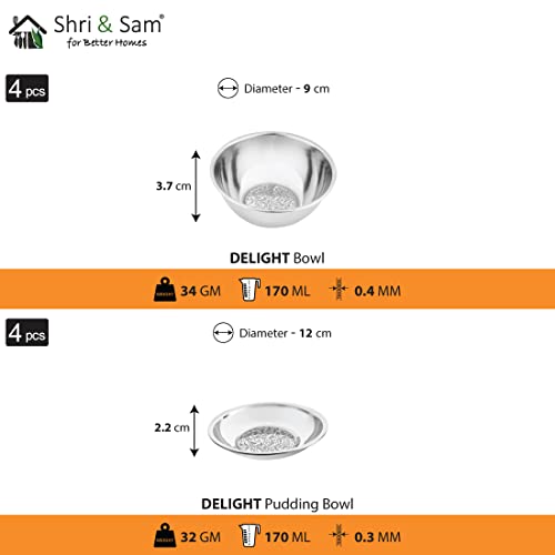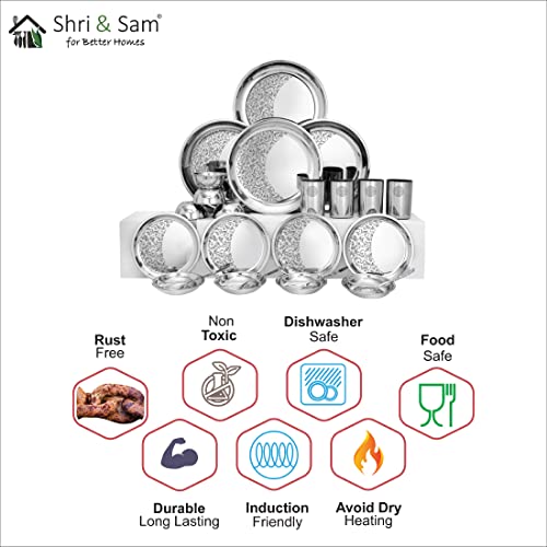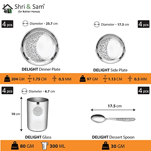Shop variety of dinnerware products from Shri & Sam available on Amazon. Offer a welcoming vibe to your dinner table with a bit of help from this mixed Shri & Sam Designer Stainless Steel Delight Laser Bloom Dinner Set 24 Pieces. Each piece in this set is safe for use in your Dishwasher for added convenience. This beautiful set includes Included Components: 4-Pieces Dinner Plates 4-Pieces Side Plates 4-Pieces Glasses 4-Pieces Bowls 4-Pieces Pudding Bowls 4-Pieces Dessert Spoons perfect Delight style which matches your tableware.