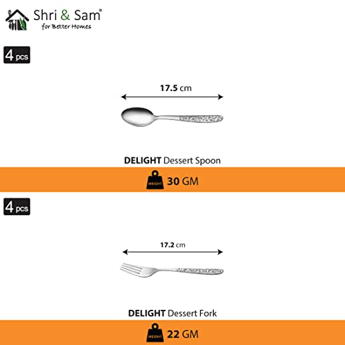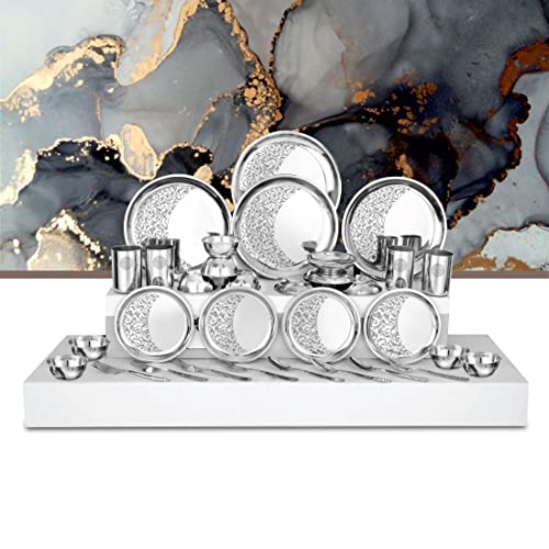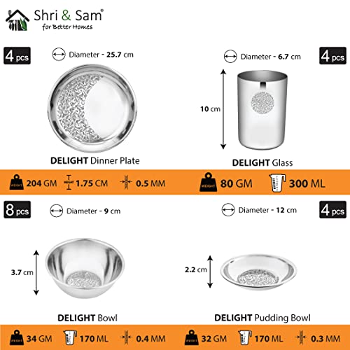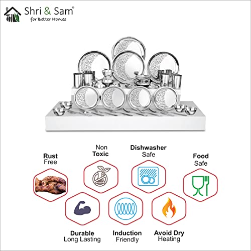 Shop variety of dinnerware products from Shri & Sam available on Amazon. Offer a welcoming vibe to your dinner table with a bit of help from this mixed Shri & Sam Designer Stainless Steel Delight Laser Bloom Dinner Set 28 Pieces. Each piece in this set is safe for use in your Dishwasher for added convenience. This beautiful set includes Included Components: 4-Pieces Dinner Plates 4-Pieces Glasses 8-Pieces Bowls 4-Pieces Pudding Bowls 4-Pieces Dessert Spoons 4-Pieces Dessert Fork perfect Delight style which matches your tableware.