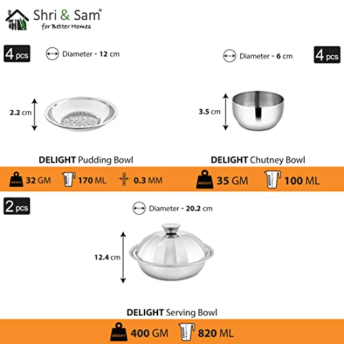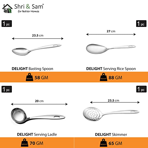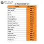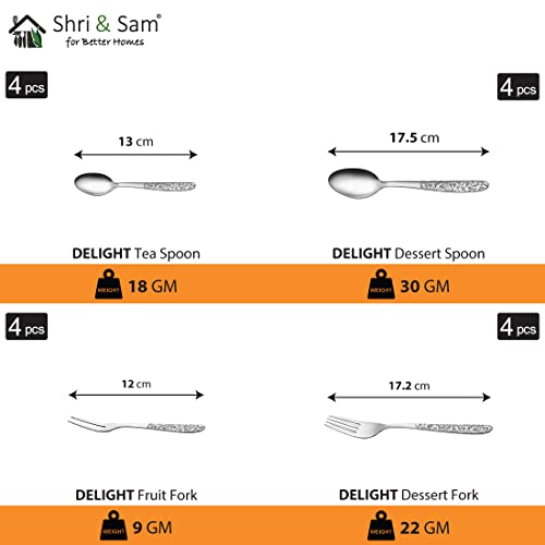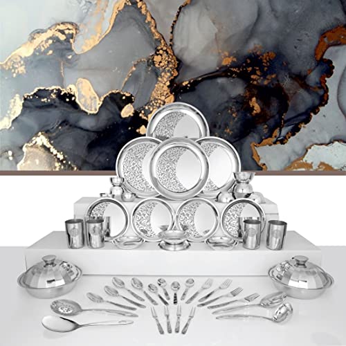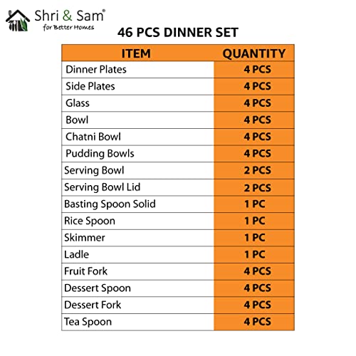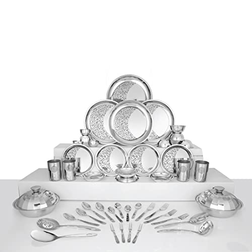 Shop variety of dinnerware products from Shri & Sam available on Amazon. Offer a welcoming vibe to your dinner table with a bit of help from this mixed Shri & Sam Designer Stainless Steel Delight Laser Bloom Dinner Set 46 Pieces. Each piece in this set is safe for use in your Dishwasher for added convenience. This beautiful set includes Included Components: 4-Pieces Dinner Plates 4-Pieces Side Plates 4-Pieces Glasses 4-Pieces Bowls 4-Pieces Chutney Bowls 4-Pieces Pudding Bowls 2-Pieces Serving Bowl with Lid 1-Piece Solid Serving Basting Spoon 1-Piece Serving Rice Spoon 1-Piece Serving Skimmer 1-Piece Serving Ladle 4-Pieces Fruit Fork 4-Pieces Dessert Spoons 4-Pieces Dessert Fork 4-Pieces Tea Spoons perfect Delight style which matches your tableware.