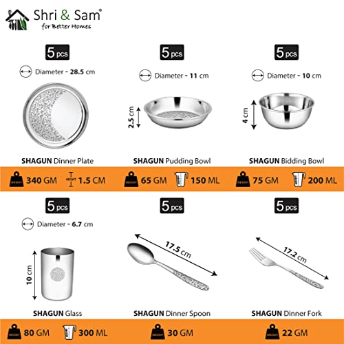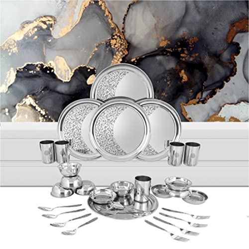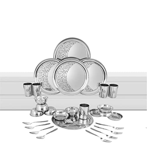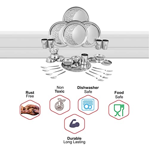 This Shri and Sam 30 PCS Stainless Steel Laser Dinner Set has a very well established look in your kitchen and ensure a better way of living. This Laser Dinner Set is made from food grade quality stainless steel which makes it a brilliant product and an ultimate combo. The quality from which the Laser Dinner Set is made is a premium quality stainless steel that makes it a way healthier life than the regular aluminum products. This makes sure that there is no food contamination and the food can be d in the same containers and can be used to serve as well. Moreover this kitchen combo set is very size efficient will fit in your kitchen effortlessly and will save you a lot of space. This combo is a complete value for money as this serving and storage set is a great add-on to your kitchen. This can be a perfect choice as it is easy on pockets and is elegant enough that it could be a stylish gift to friends and family. Material - Stainless steel Color - Silver Diameter of plates - Dinner plate: 28.5 cm Diameter of bowls - Curry bowl: 10 cm pudding bowl: 11 cm Length of cutlery - Dinner spoon: 17 cm Dinner fork: 18 cm Capacity - Bowl: 200 ml Glass: 300 ml Height - Dinner plate: 1.5 cm Glass: 10 cm Bowl: 4 cm Package Weight - 3.6 kg Production - Made in India
