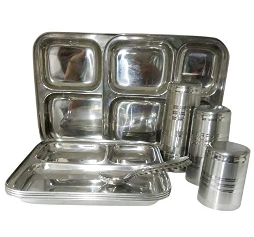 This set has been beautifully designed to add grace to your dining experience.It is easy and fun even for the picky eaters. This stainless steel plate has 3 section divided parts so you can separate dishes while serving everything in one plate. It is perfect for introducing a balanced diet and new foods. This stainless steel plate with compartments can also used in mess, halls, parties, pantry, canteen, schools, collages, hotels, restaurant and other services. This divided plate for kids has separate compartments to prevent food from sliding and mixing. This stainless steel dinner plate is great for holding rice, salad, vegetable or other food. Great for home, camping, picnic. This plate is washable and reusable.This plate can be carried outside conveniently. Too often eating outdoors or with young children means breaking out the disposable plates that won't break, usually this means turning to plastics or throw-away paper plates. All dishes can be served together in one plate. Inside or outside - these platters make meal time neat. Make your meal time easier by yourselves. With galss set is perfect for serving lemonade, water, juice etc.These Glasses can be used at home as well as at Hotels and restaurants. These can be easily cleaned and maintained.With also teaspoon, dessert spoon, the table spoon of durability and utility. it has a multipurpose use and can be used for serving fruits, snacks and dinner