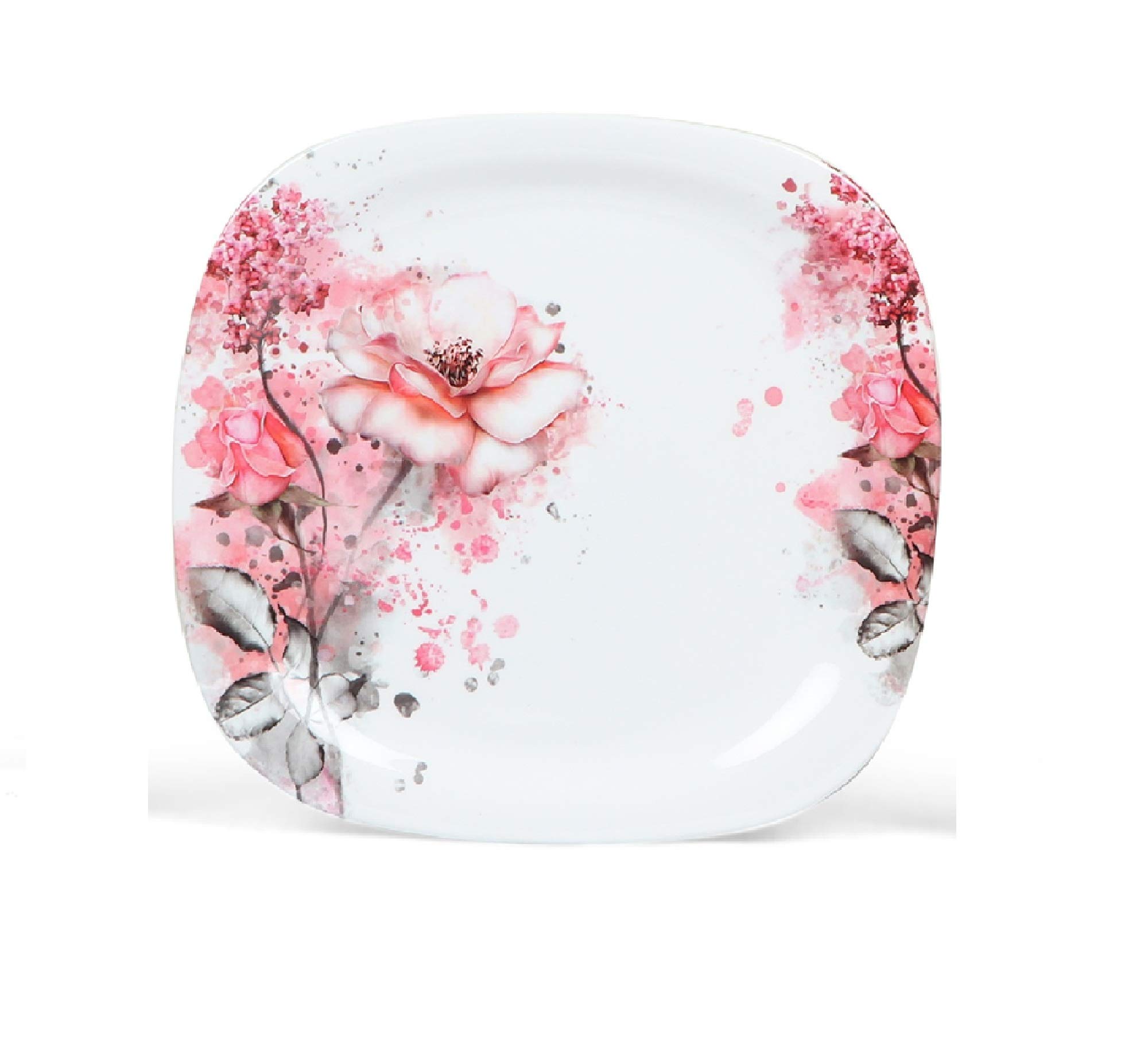 Golden Fish Beautiful Flower Printed Melamine Square Dinner Plate and Veg. Bowl (Pink, 11 Inches) - Set of 6 Both