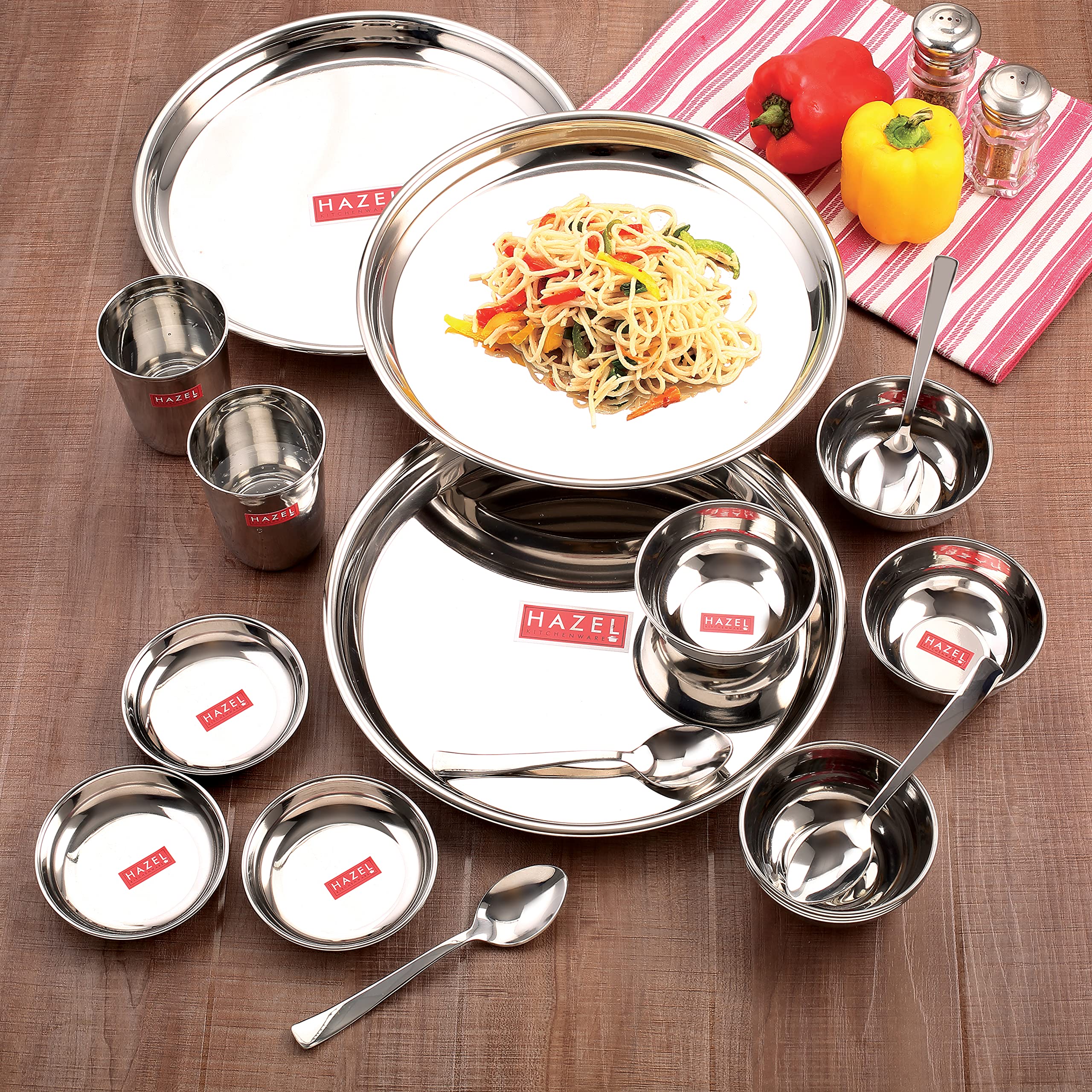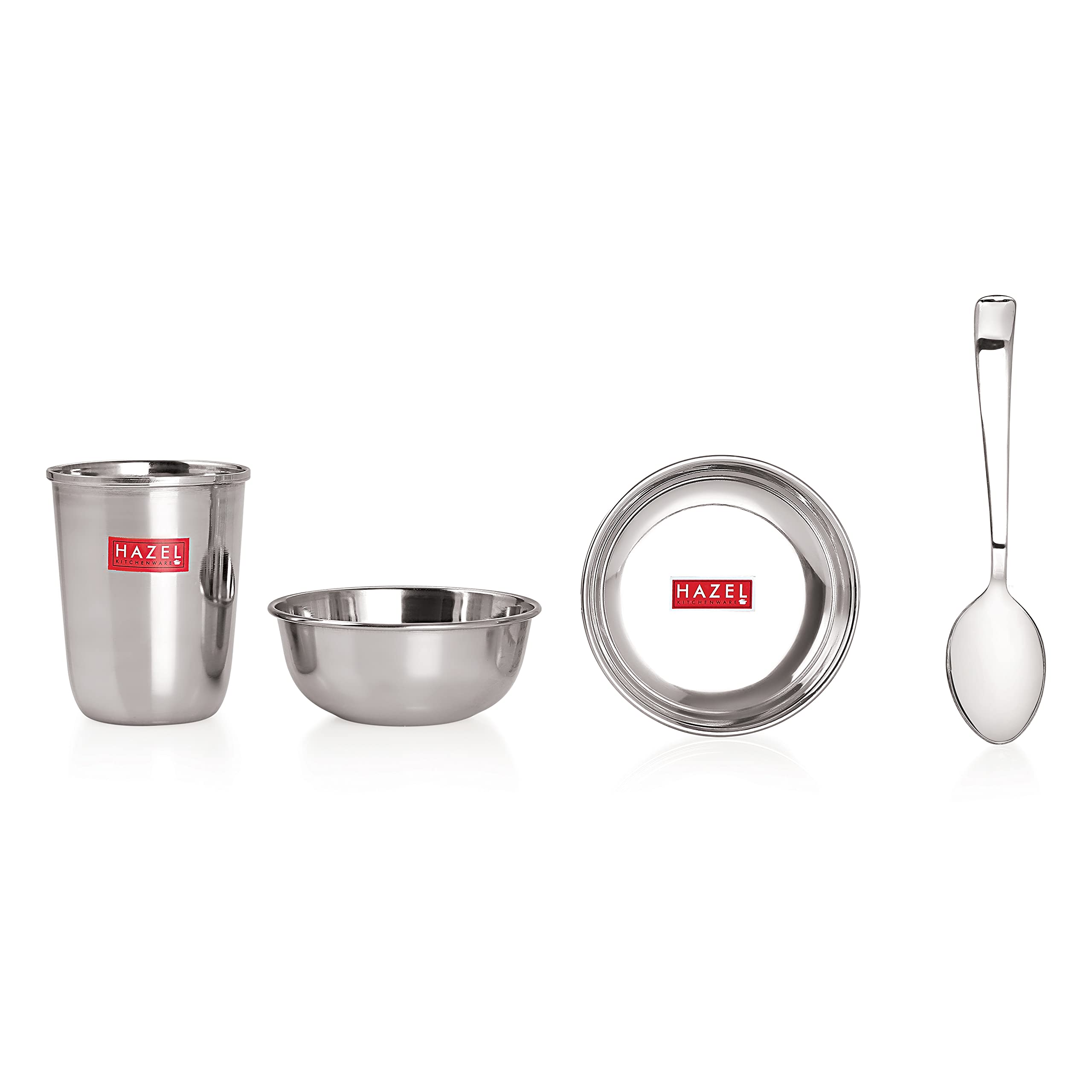 24 pcs Stainless steel Dinner plate set (4 Steel Plate 4 Steel Glass 8 Bowl 4 Spoon 4 Dessert Plate). It is for multipurpose use for in home offices and restaurants. It is the basic plate which is required everywhere. This set is made from high quality stainless steel making it exclusive and durable. Stainless steel is hygienic to use and easy to clean as compared to other materials. An excellent choice if you are redoing your kitchen or want to replace your current dinner set with a trendy and contemporary one. Contemporary minimalistic design to suit your refined taste. Stainless steel is hygienic to use and easy to clean as compared to other materials. This set can be nested one into another and therefore helping save shelf space in the kitchen This set is perfect for gifting purposes at weddings anniversaries. You get a magnificent dinner set at an extremely affordable price.