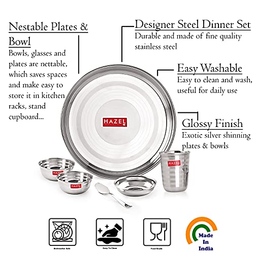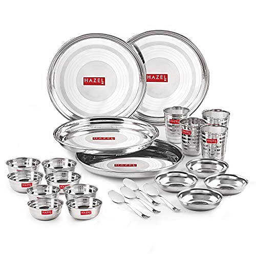 Featuring a set of 24 piece stainless steel dinner set including (4 Steel Plate 4 Steel Glass 8 Bowl 4 Spoon 4 Dessert Plate). Featuring a highly attractive design this dinner set will surely impress your lunch and dinner guests while providing a great canvas to showcase your delicious food. Apart from your own use you can also give this dinner set to your loved ones as a perfect gifting option on special occasions or festivals. Its strong and sturdy construction makes this set an ideal solution for both special occasions as well as everyday meals. Furthermore all plates spoons and bowls in this set are rust-proof and hygienic preventing contamination of your food. The individual pieces in this dinner set can be nested together and this makes them ideal to stack up and away when not being used saving valuable kitchen space. You can easily clean this dinner set with a simple detergent solution and retain its shiny looks for a long time.
