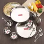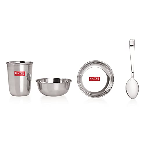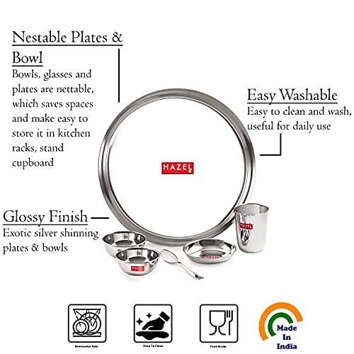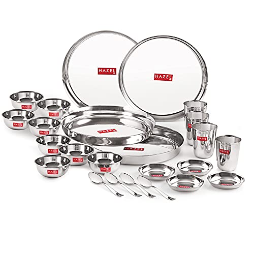 Featuring a set of 24 piece stainless steel dinner set including (4 Steel Plate 4 Steel Glass 8 Bowl 4 Spoon 4 Dessert Plate). It is very economical in range made of food grade stainless steel. It is non breakable durable sturdy rust free and long lasting. An excellent choice if you are redoing your kitchen or want to replace your current dinner set with a trendy and contemporary one. Contemporary minimalistic design to suit your refined taste. Stainless steel is hygienic to use and easy to clean as compared to other materials. This set can be nested one into another and therefore helping save shelf space in the kitchen This set is perfect for gifting purposes at weddings anniversaries. You get a magnificent dinner set at an extremely affordable price.