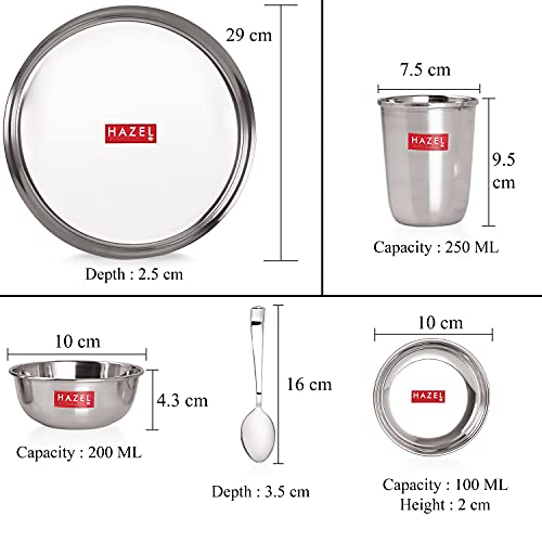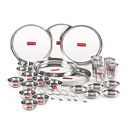 Featuring a set of 30 piece stainless steel dinner set including (5 Steel Plate 5 Steel Glass 10 Bowl 5 Spoon 5 Dessert Plate). It is very economical in range made of food grade stainless steel. It is non breakable durable sturdy rust free and long lasting. An excellent choice if you are redoing your kitchen or want to replace your current dinner set with a trendy and contemporary one. Contemporary minimalistic design to suit your refined taste. Stainless steel is hygienic to use and easy to clean as compared to other materials. This set can be nested one into another and therefore helping save shelf space in the kitchen This set is perfect for gifting purposes at weddings anniversaries. You get a magnificent dinner set at an extremely affordable price.