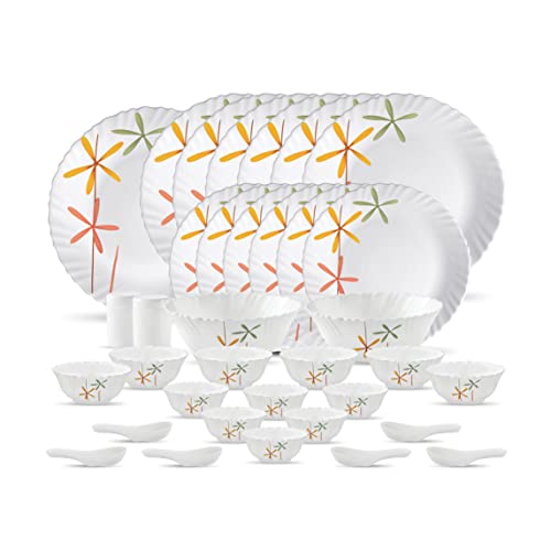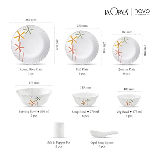 See your dinner table bloom with our stunning 35 pcs dinner set. A wonderful choice for refreshing your dinnerware this beautiful dinner set is complete in itself to have you covered for any occasion. Decorated with a beautiful floral design our opal glass dinner set will offer a formal finish to any setting. It is perfect for entertaining guests as well as special meal times with the family. This dinner set includes 1 rice plate 6 full plates 6 quarter plates 6 soup bowls 6 veg bowls 6 soup spoons 2 serving bowls and 2pc salt and pepper set. (1pc Round Rice Plate- H-3.0cm 28.0cm Top Dia W-480gm 6pcs Full Plate : H-2.5.0cm 25.5.0cm Top Dia W-430gm 6pcs Quarter Plate : H-1.5cm 18.0cm Top Dia W-200gm 2pcs Serving Bowl : H-6.5cm 17.5cm Top Dia W-285gm 850ml Capacity 6pcs Soup Bowl : H-5.0cm 11.5cm Top Dia W-135gm 270ml Capacity 6pcs Veg. Bowl : H-4.3cm 10.cm Top Dia W-115gm 175ml Capacity 6pcs Soup Spoon : H-1.5cm L-4.3cm W-13.3cm W-50gm 2pcs Salt & Pepper Pot : H-5.3cm 4.0cm Round Dia W-60gm.)