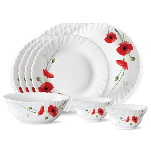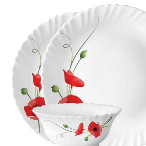 Larah by BOROSIL Red Carnations Opalware Dinner Set (White) - 13-Pieces