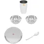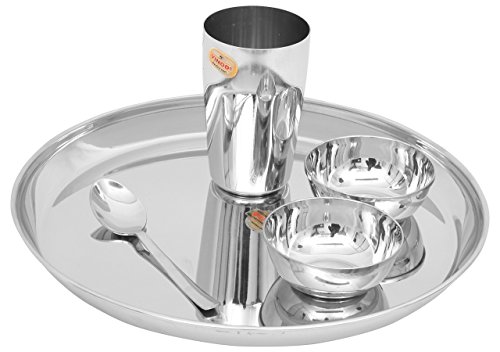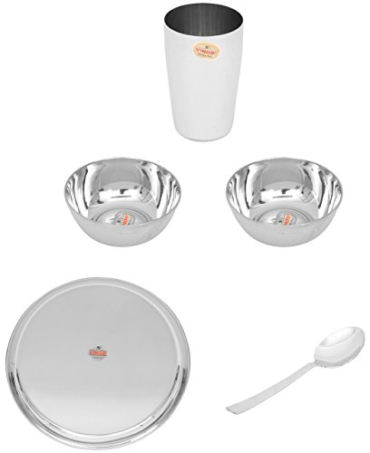 Vinod presents this silver color dinner set. It is made of stainless steel. This package contains 1 plate 2 bowls 1 glass and 1 spoon. It has seller warranty up to 10 years and the replacement warranty is available against manufacturing defects only.