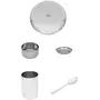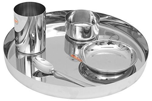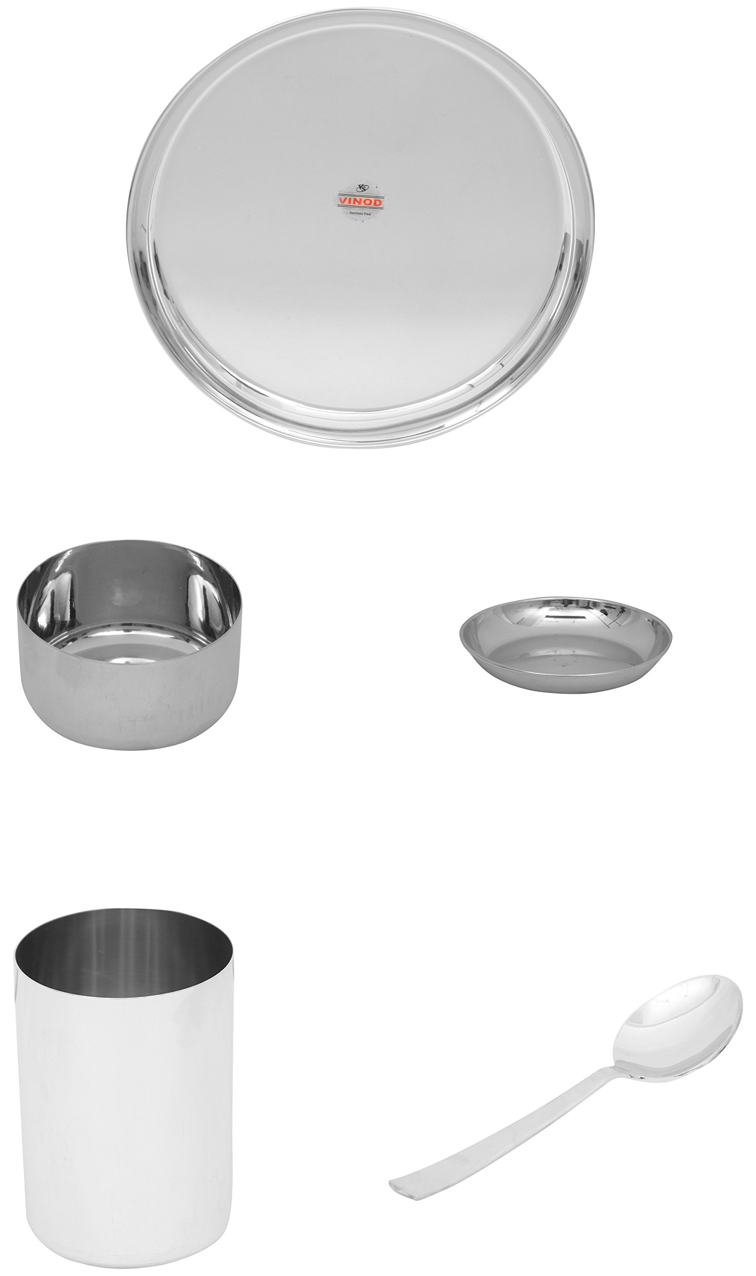 Vinod presents this silver color dinner set. It is made of stainless steel. This package contains 1 plate 2 bowls 1 glass and 1 spoon. It has seller warranty up to 10 years and the replacement warranty is available against manufacturing defects only.