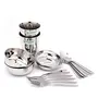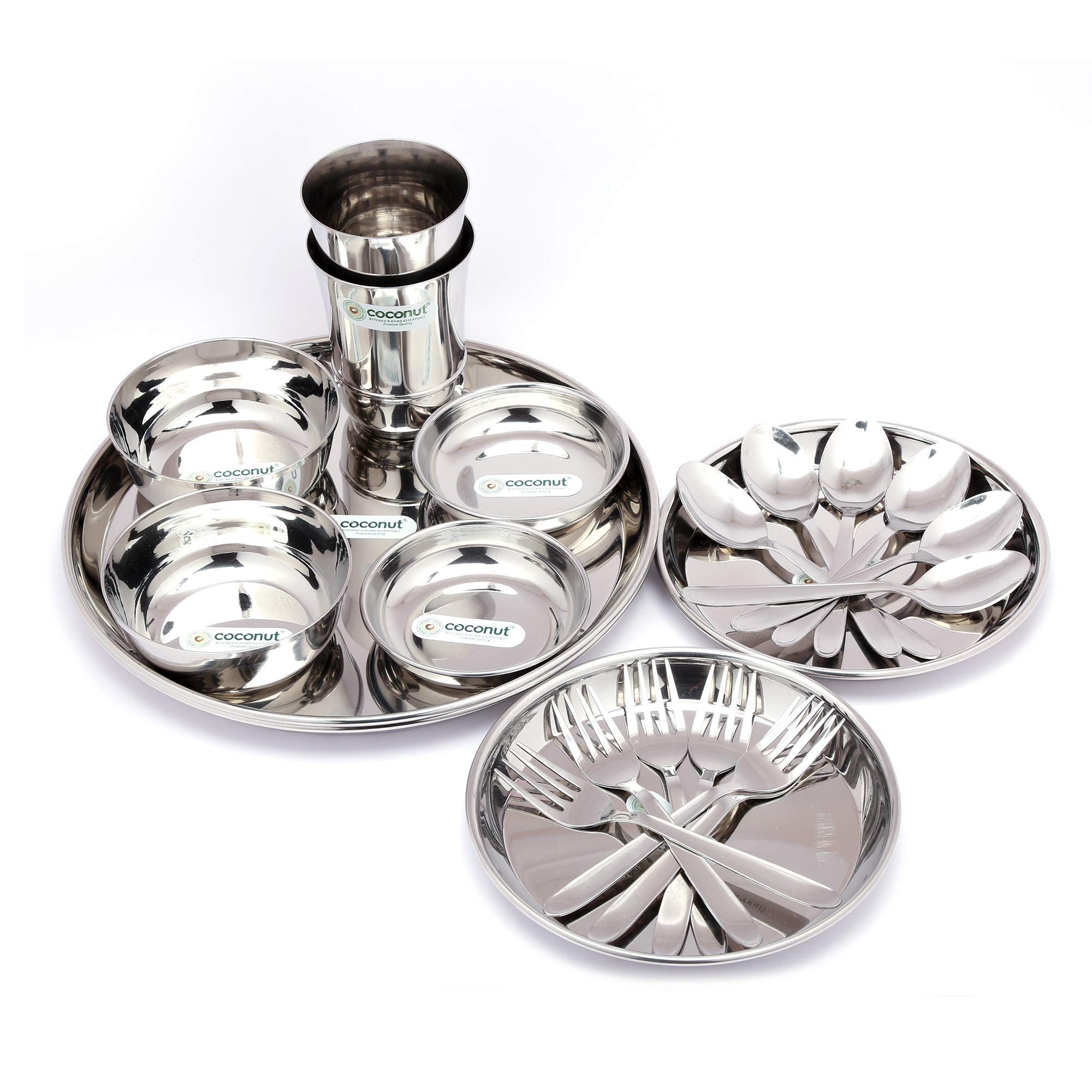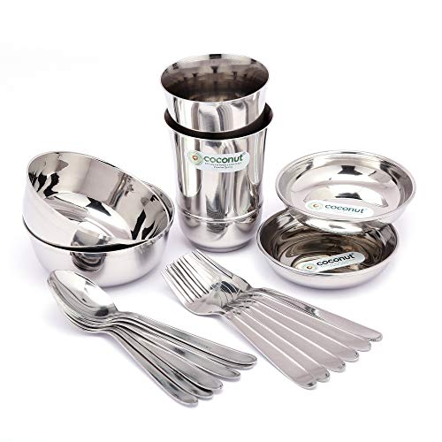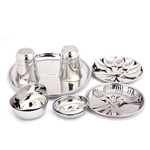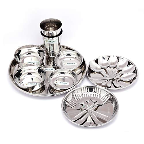 Coconut is a range of innovative and Quality products for Home and Kitchen.Coconut always keeps striving to provide you with the most authentic products. Add Something Unique To Your Dinnerware With this 22 Piece Dinner Set. These Dinner Sets are crafted from Food Grade Finest Quality Stainless Steel material. Rust proof and Hygienic. It is very easy to clean and maintain. Dishwasher Safe & BPA free. This can be used as Gifting options for your Relatives or Friends on the Occasions like Marriage House warming Ceremony and other events. And it is also useful for Big and Joint Families to enjoy the Lunch or Dinner together. Product Content : SS 22 Pieces Dinner Set -(P3 Size -12 -Big Dinner Plates - 2 Qty - Dimension - 10 Inches) (P3 Size - 8 - Small Qater Plates - 2 Qty) (B2 Water Glass (200 Approx) - 2 Qty) ( C9 Mukta Vati Bowls Size -6 - 2 Qty) (Halwa Plate Bowl - 2 Qty) ( Mater Fork - 6 Pieces ) (Master Spoons - 6 Pieces).