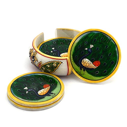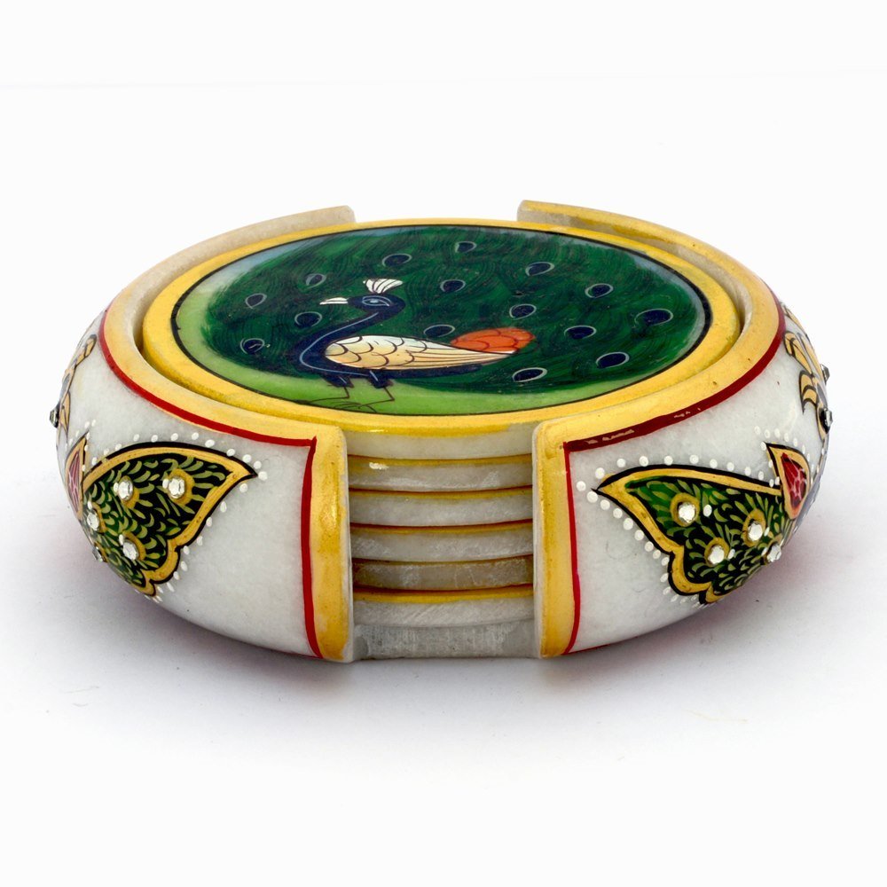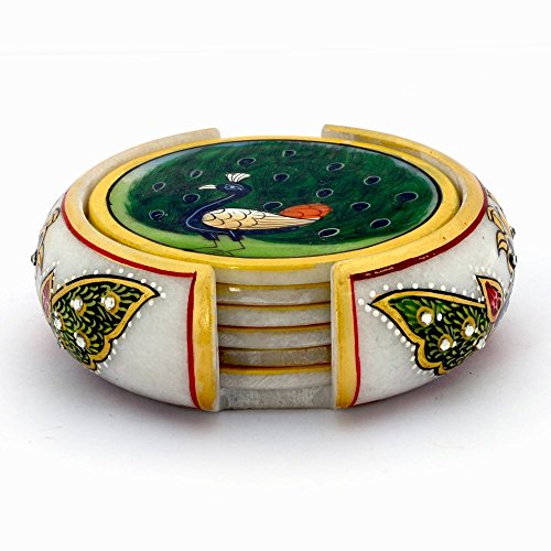 This set of six handcrafted round shaped tea coasters and stand is made of marble. The beauty of this item is beautiful painting on each coaster. This utility item can be used as a show-piece in your drawing room or on your dining table.