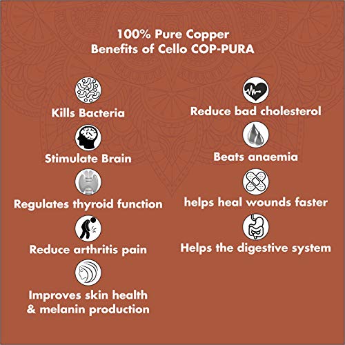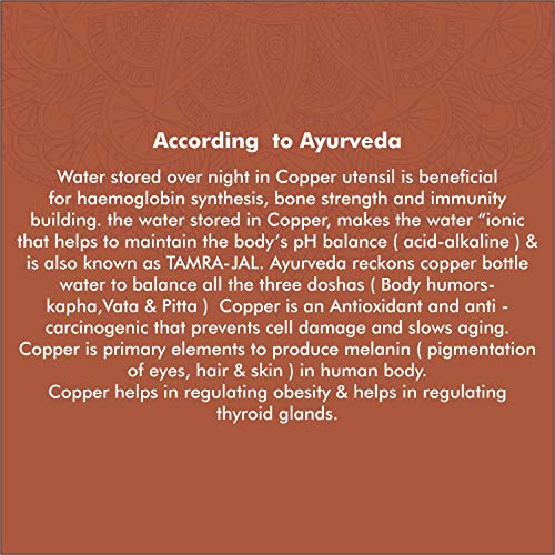 • Drinking water from a copper bottle has numerous health benefits such as regulating thyroid and arthiritis conditions improve general skin and health and also help digestion.