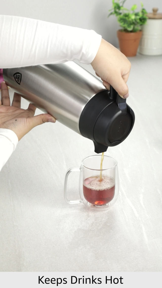 The stainless steel broad based flask is very useful in keeping beverages hot in homes as well as offices. The flask comprises of a handle for convenience a deep spout for pouring out liquids and a push button for closing and opening of the flask.