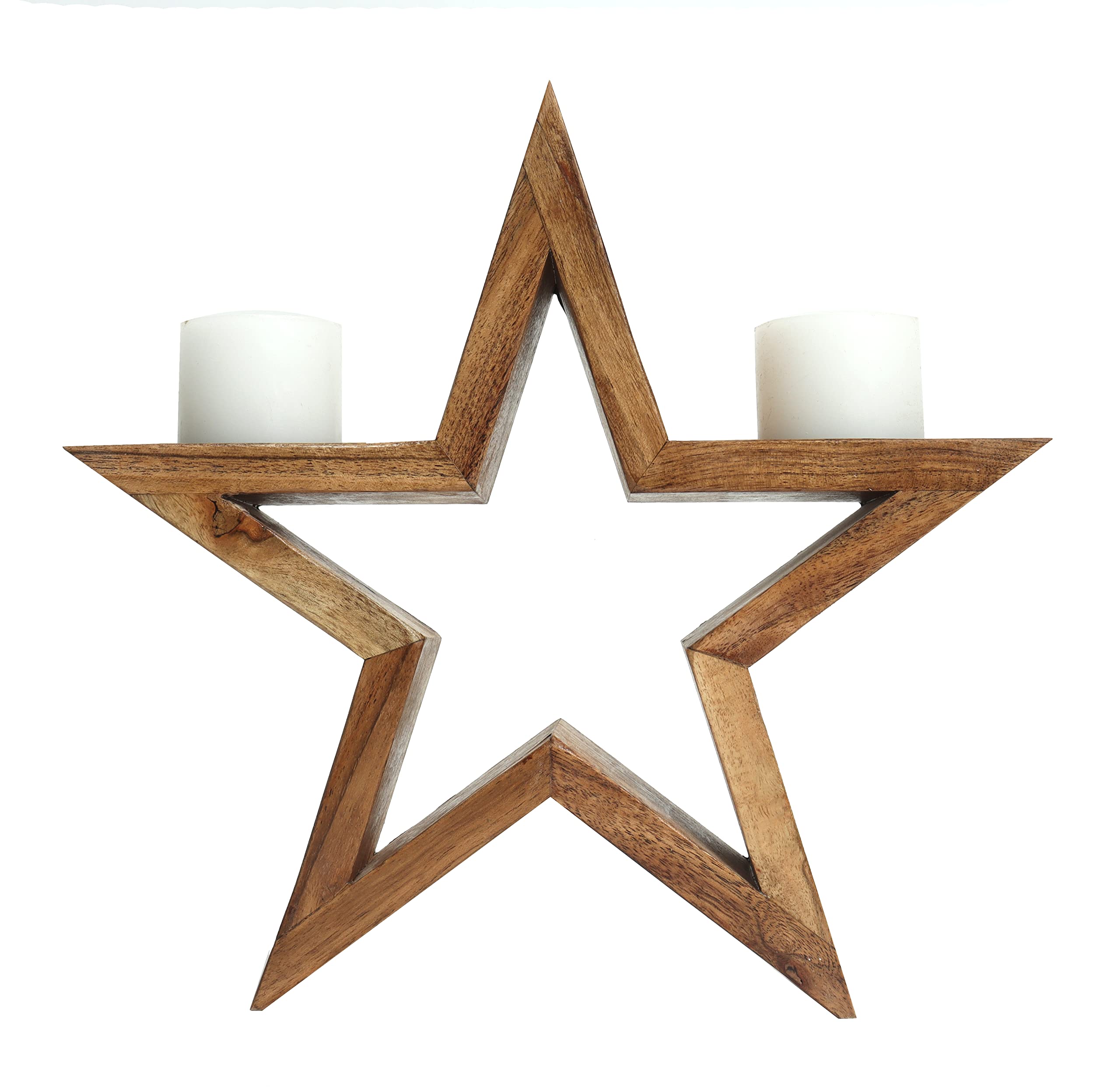 Equal parts classic and modern these Star shape candle holders set the scene for a sophisticated table top no matter the occasion. The Star candle holder set is your new go to piece for adding that perfect rustic touch. Whether it's on the office bookshelf or at the center of the dining table the wood holders spark a sophisticated warmth you typically only find in a cozy mountain lodge. Sturdy and sure to last this set is the perfect pair to your favorite candles.